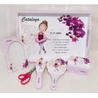 Produs decorat manual, personalizat în mod delicat si unic, creat special pentru a adăuga o nota de farmec evenimentului copilului tău. Piesele sunt din lemn/mdf, decorate cu vopsele pe bază de apa, si lăcuite pentru protecție si rezistentă în timp. Tehnica de realizare este pictură basic si transfer de imagine. Produsele sunt bine finisate, nu se îngălbenesc si sunt rezistente la uzura normală. Pentru că sunt realizate manual, reproducerea lor poate avea ușoare diferențe de nuanțe sau dimensionare a imaginilor. Setul conține tava, cutiuță pentru șuviță, perie/pieptănaș, oglindă de mână, ramă foto si forfecuț.