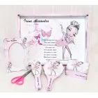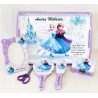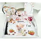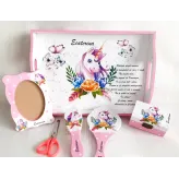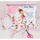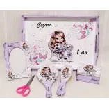 Produs decorat manual, personalizat în mod delicat si unic, creat special pentru a adăuga o nota de farmec evenimentului copilului tău. Piesele sunt din lemn/mdf, decorate cu vopsele pe bază de apa, si lăcuite pentru protecție si rezistentă în timp. Tehnica de realizare este pictură basic si transfer de imagine. Produsele sunt bine finisate, nu se îngălbenesc si sunt rezistente la uzura normală. Pentru că sunt realizate manual, reproducerea lor poate avea ușoare diferențe de nuanțe sau dimensionare a imaginilor. Setul conține tava, cutiuță pentru șuviță, perie/pieptănaș, oglindă de mână, ramă foto si forfecuț.