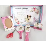 Produs decorat manual, personalizat în mod delicat si unic, creat special pentru a adăuga o nota de farmec evenimentului copilului tău. Piesele sunt din lemn/mdf, decorate cu vopsele pe bază de apa, si lăcuite pentru protecție si rezistentă în timp. Tehnica de realizare este pictură basic si transfer de imagine. Produsele sunt bine finisate, nu se îngălbenesc si sunt rezistente la uzura normală. Pentru că sunt realizate manual, reproducerea lor poate avea ușoare diferențe de nuanțe sau dimensionare a imaginilor. Setul conține tava, cutiuță pentru șuviță, perie/pieptănaș, oglindă de mână, ramă foto si forfecuț.