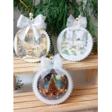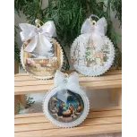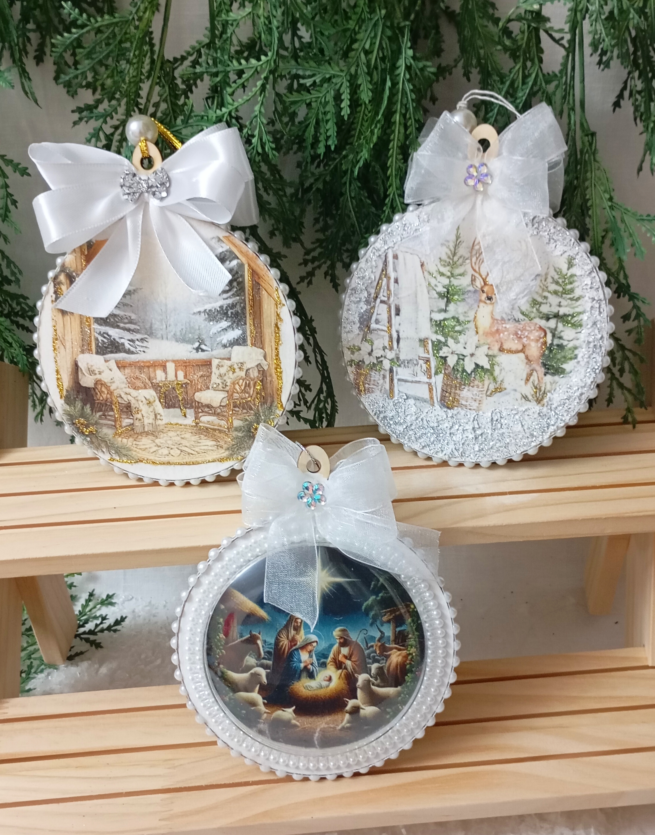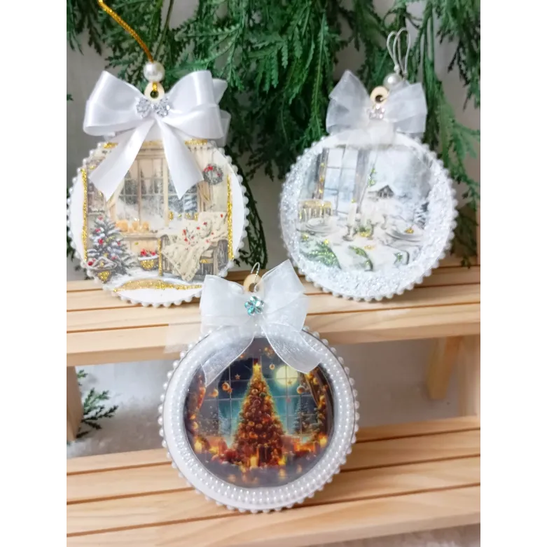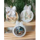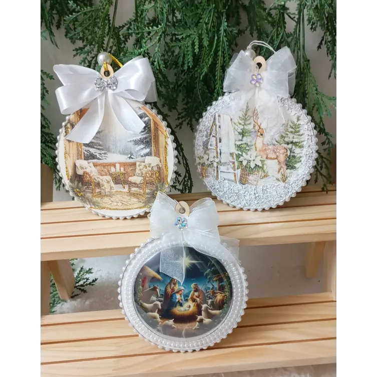 Globuri din lemn realizate prin tehnica decoupage cu imagini de iarna .
