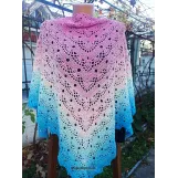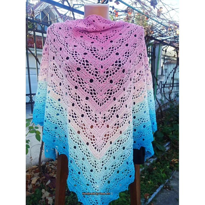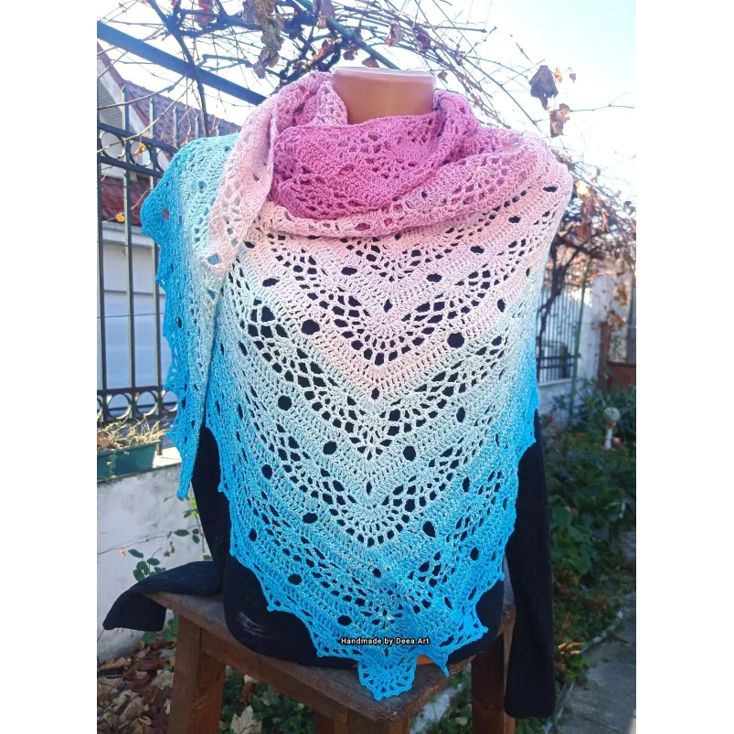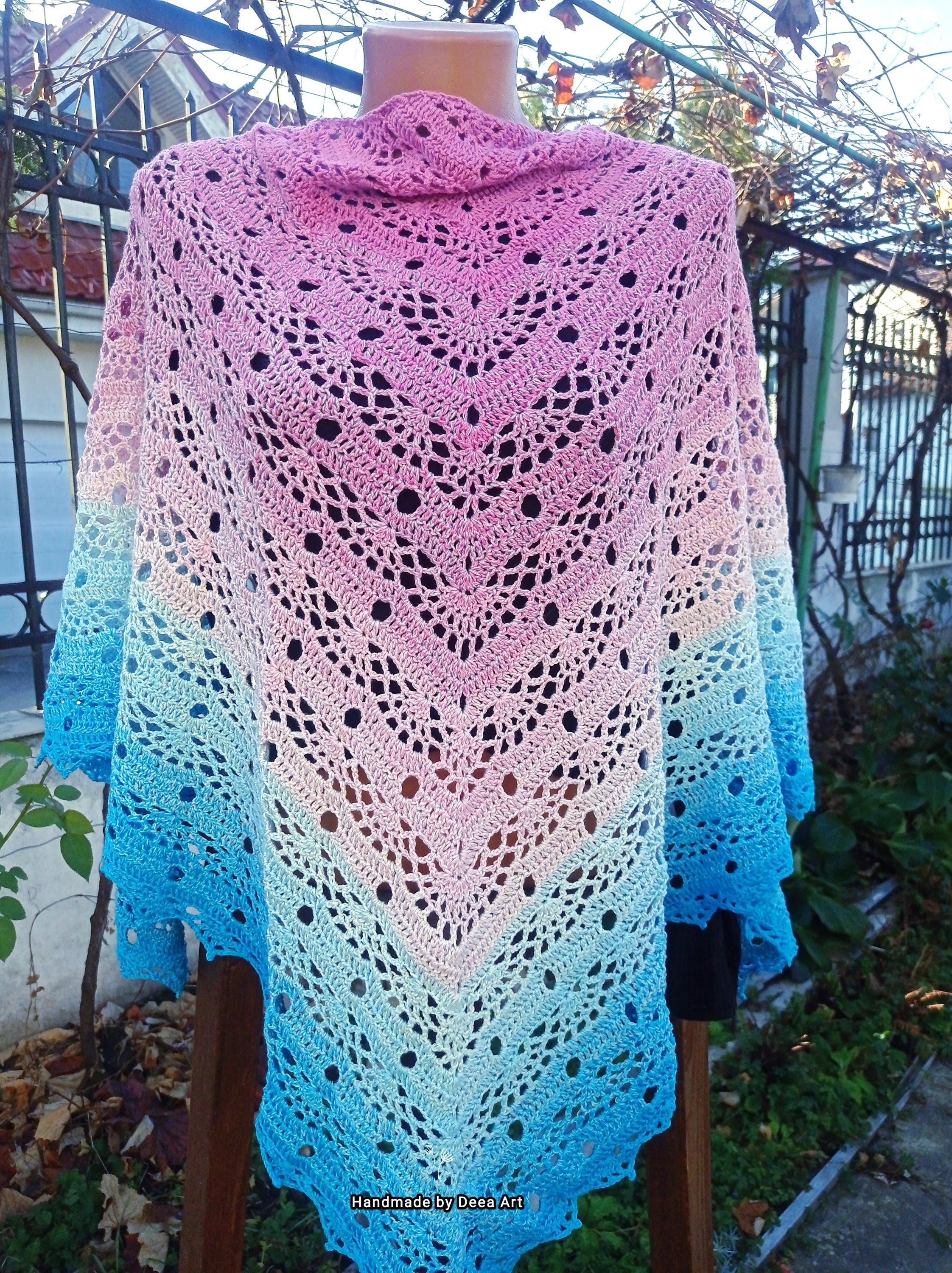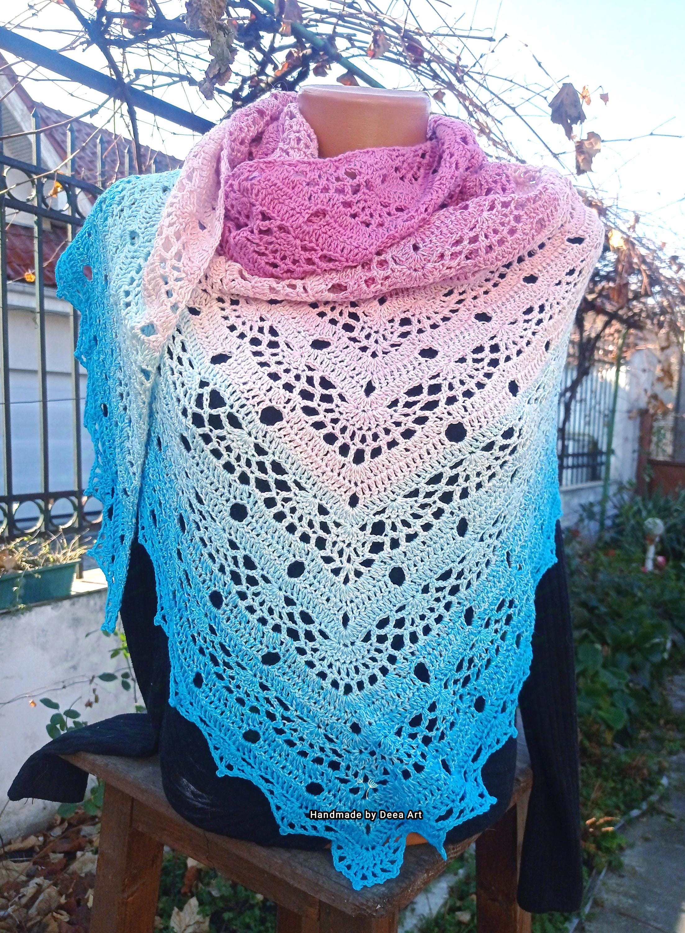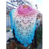 Sal croșetat manual, lucrat după patternul SisLove Shawl by SisHomemade, din bumbac cu acril, in superbe combinații de albastru și roz, accesoriul ideal oricărei ținute, poate fi purtat ca și eșarfă sau pe umeri.