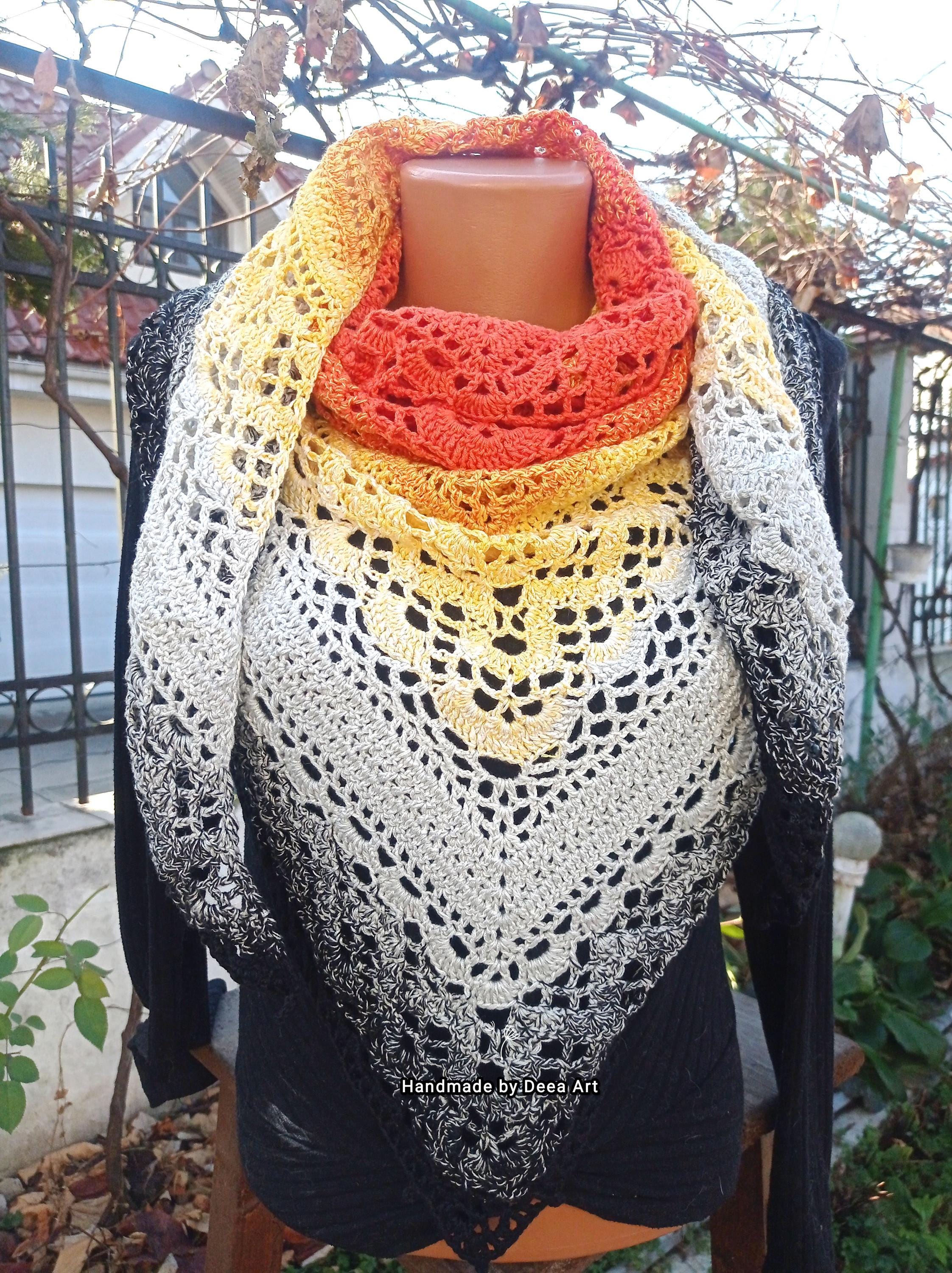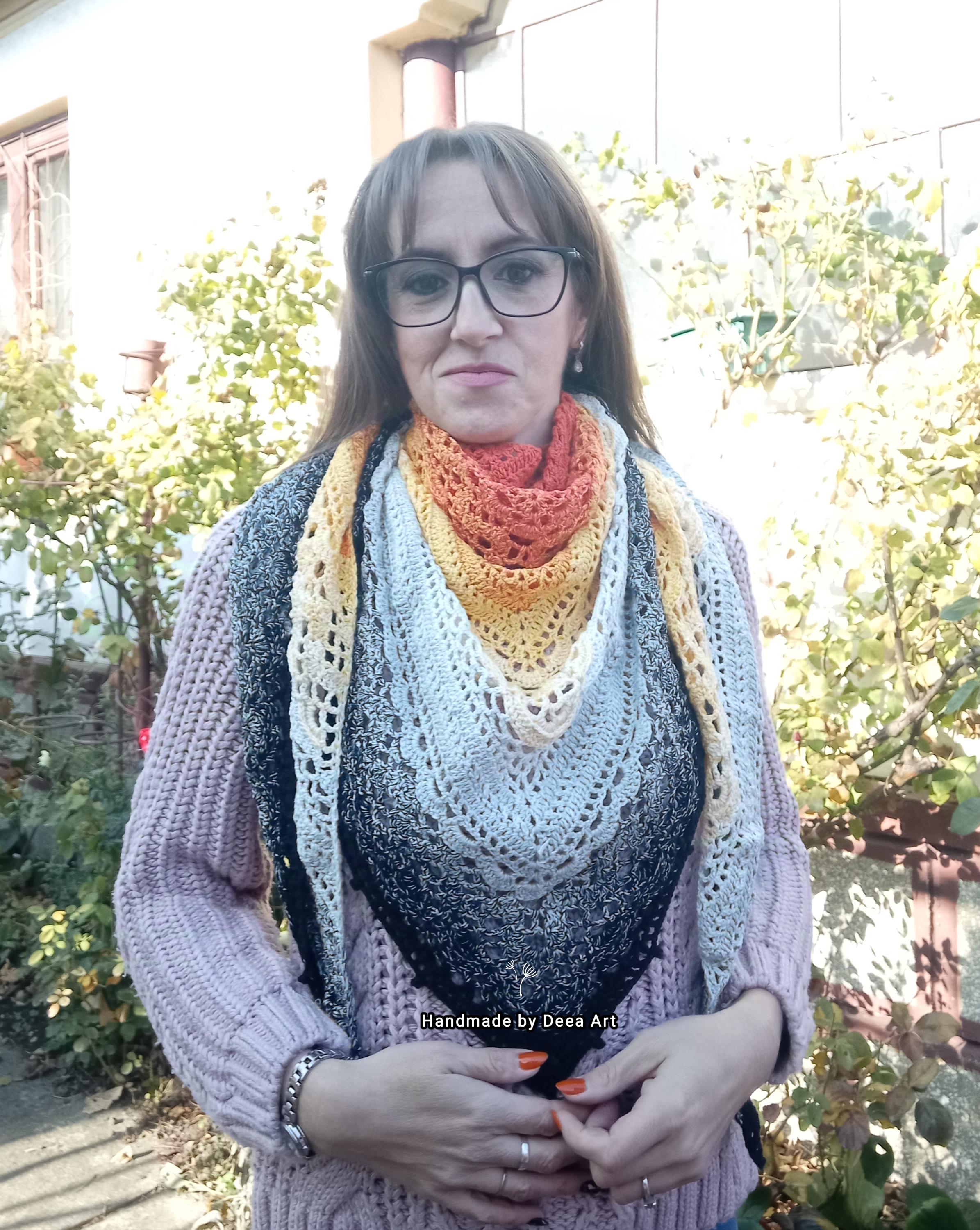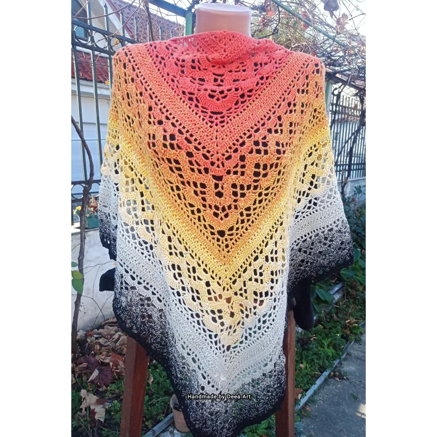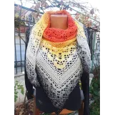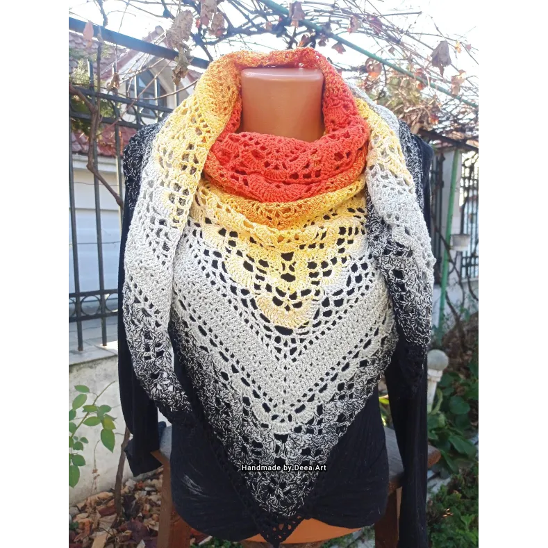 Sal croșetat manual, lucrat după patternul Klaziena Shawl by Kirsten Bishop, din bumbac cu acril, in superbe combinații de portocaliu, alb, negru și galben, accesoriul ideal oricărei ținute, poate fi purtat că și eșarfă sau pe umeri.