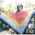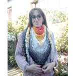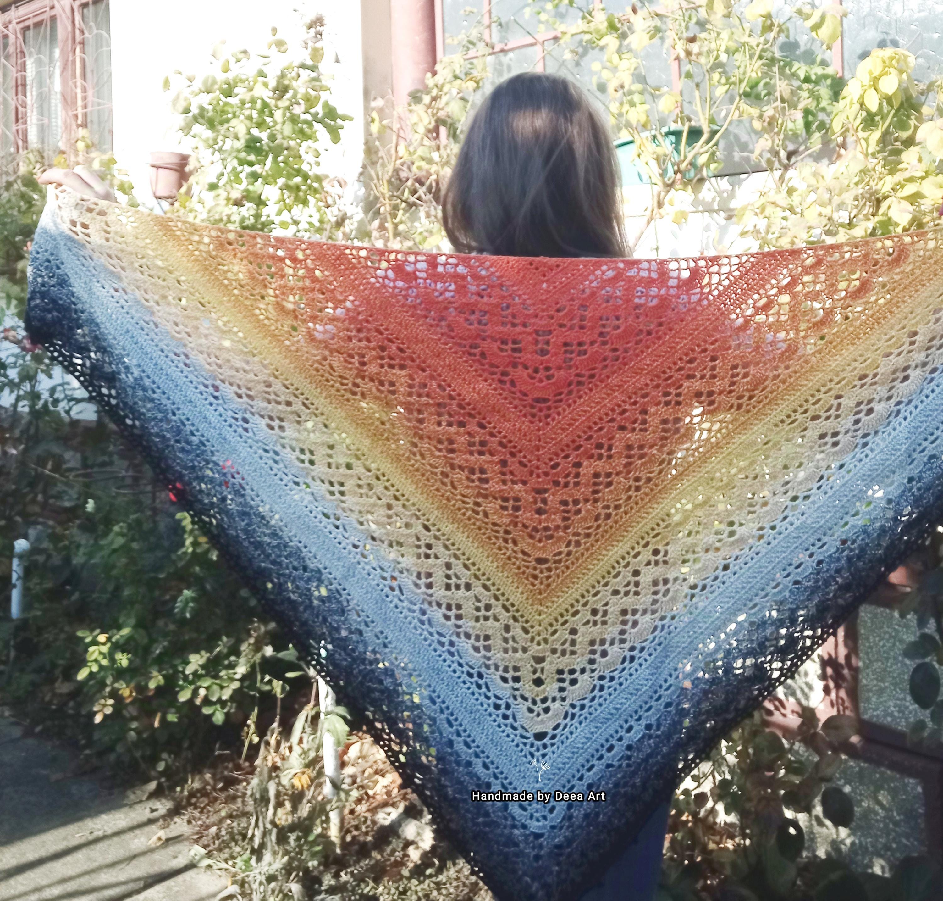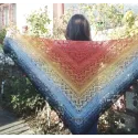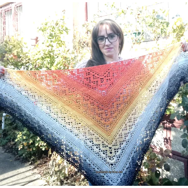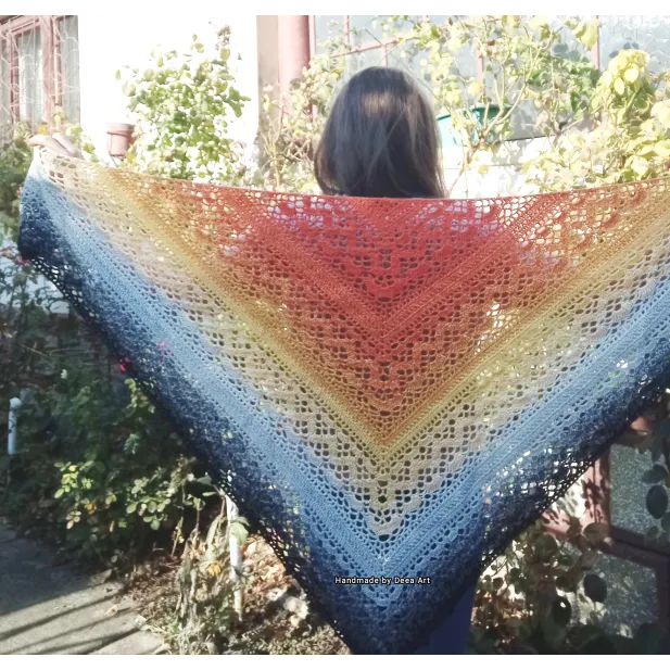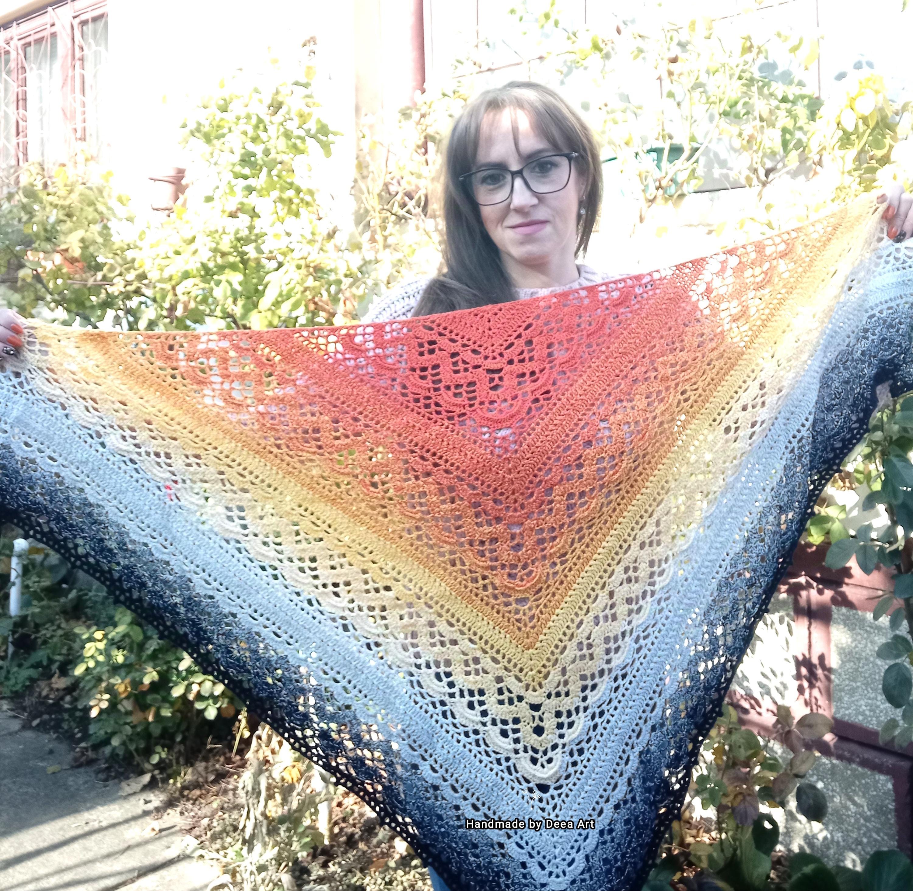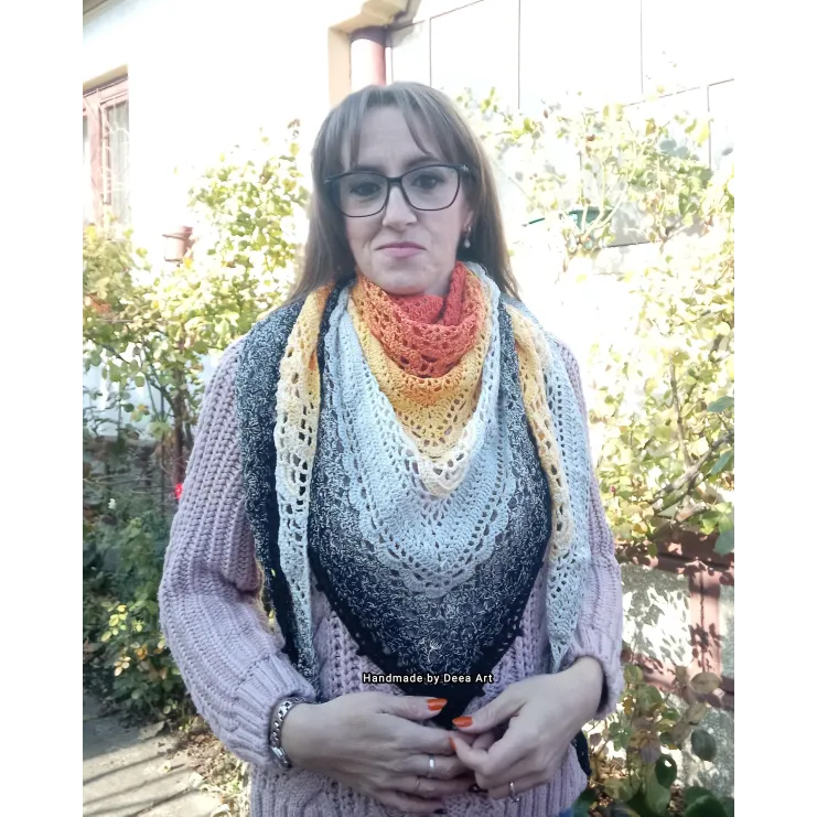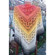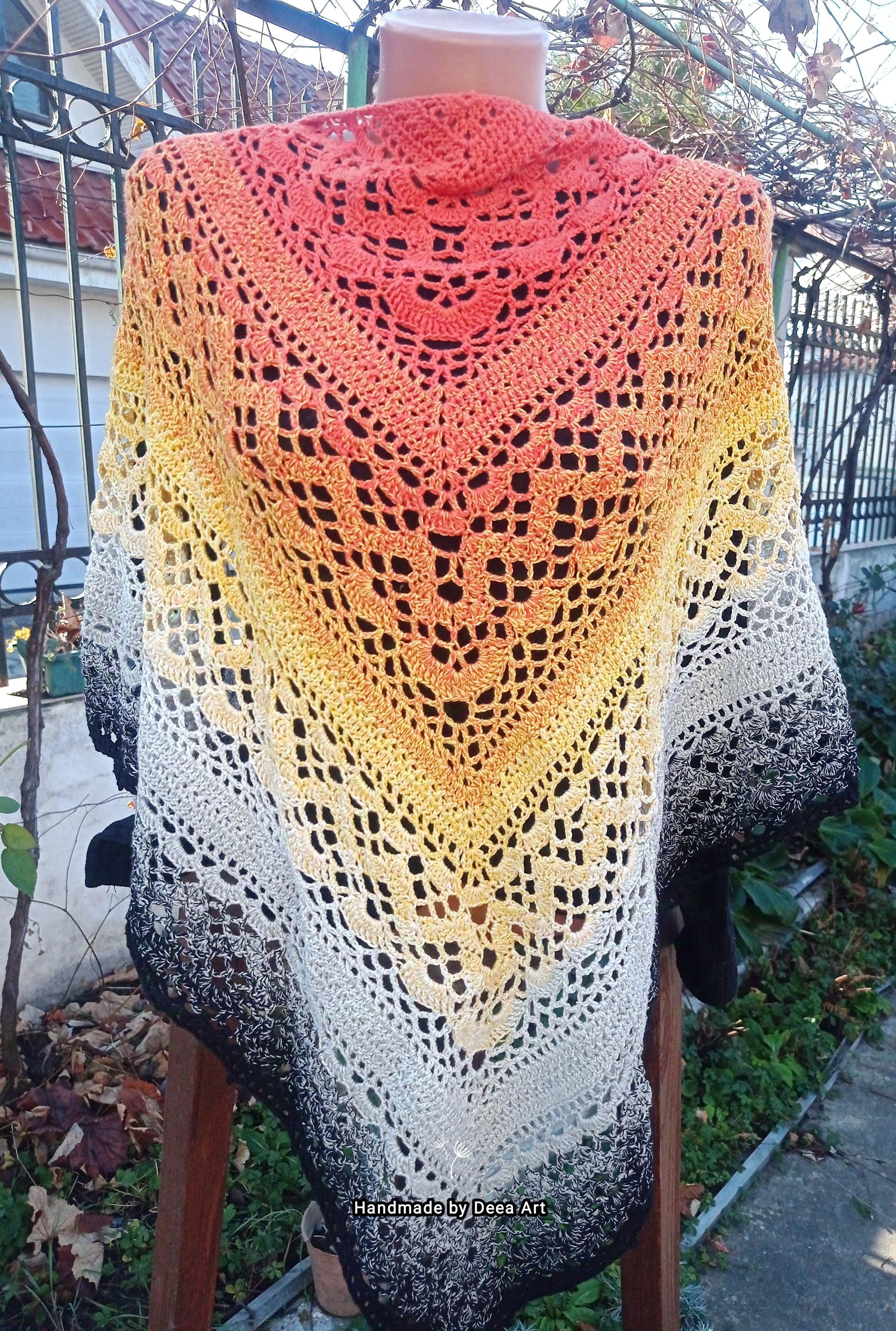Sal croșetat manual, lucrat după patternul Klaziena Shawl by Kirsten Bishop, din bumbac cu acril, in superbe combinații de portocaliu, alb, negru și galben, accesoriul ideal oricărei ținute, poate fi purtat că și eșarfă sau pe umeri.