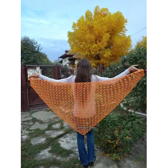 Sal croșetat manual, lucrat după patternul Klaziena Shawl by Kirsten Bishop, din bumbac cu acril, in superbe combinații de portocaliu, alb, negru și galben, accesoriul ideal oricărei ținute, poate fi purtat că și eșarfă sau pe umeri. Lucrat din fire de calitate, moale și fin, poate fi cadoul ideal potrivit oricărei ocazii. Instrucțiuni de intretinere: - se spala manual, in ap a la temperatura de maxim 30° - se stoarce de excesul de apa intr un prosop curat, prin presare -se usucă pe suprafața plana, întins, pentru a și pastra forma - nu se spala in mașină de spălat - nu se usucă in uscător, nu se calca, nu se folosește...