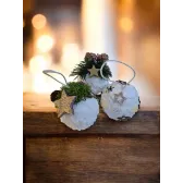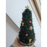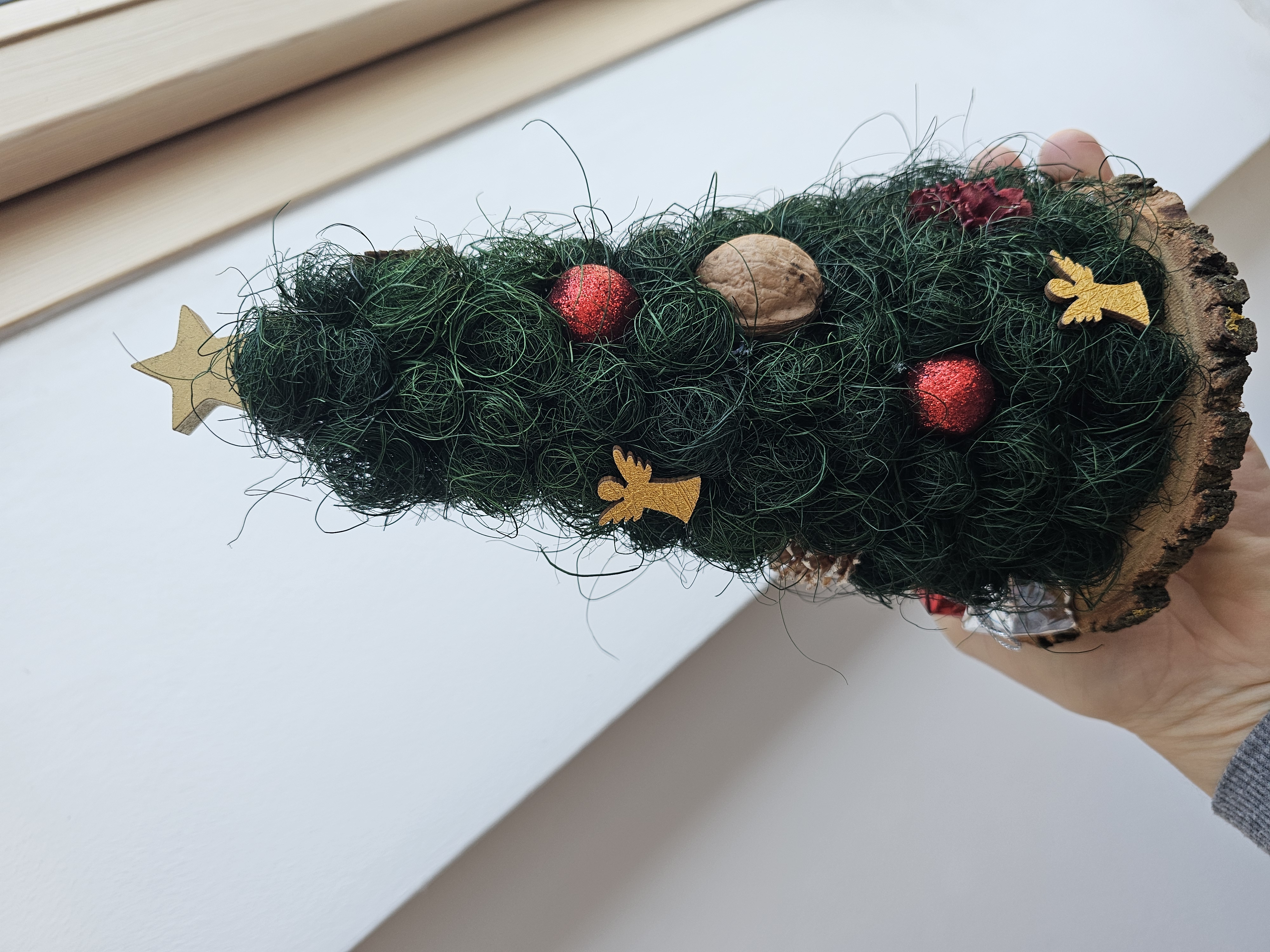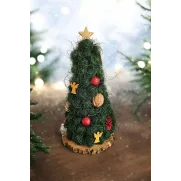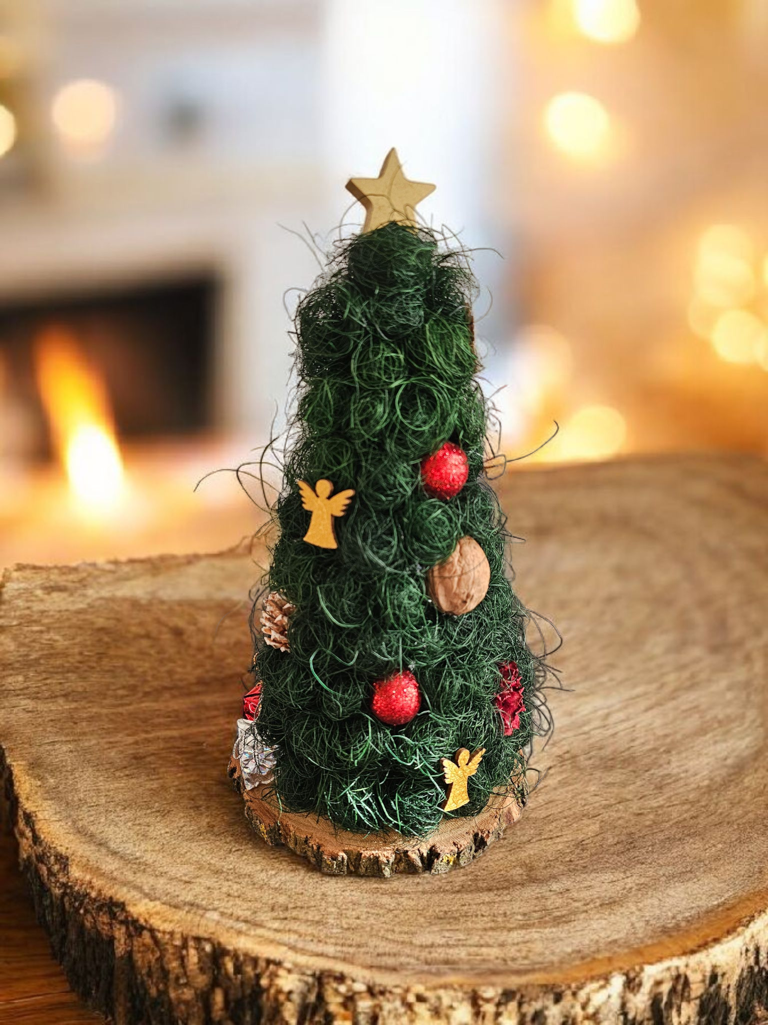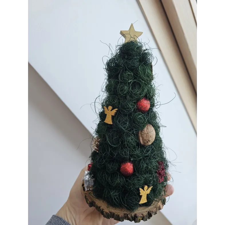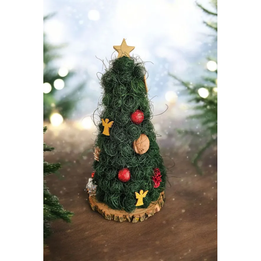 Brăduțul este lucrat manual din sisal, având suport o felie de lemn. Este împodobit cu diverse ornamente. Are înălțimea de aproximativ 22-23 cm. Perfect pentru a fi așezat pe masa festivă de Crăciun sau de asemenea, poate fi un cadou drăguț în prag de sărbători.