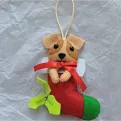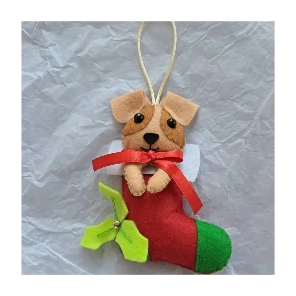 Decorațiunea e realizată manual din fetru și umplută cu puf hipoalergenic. Ochii cățelului sunt din plastic, cu protecție (nu cad).