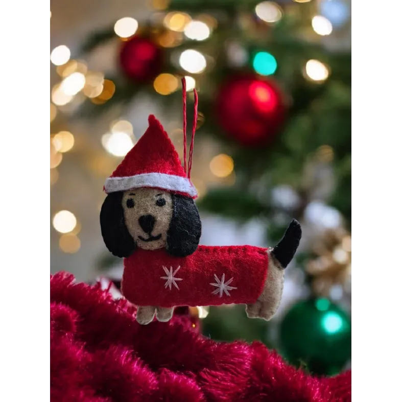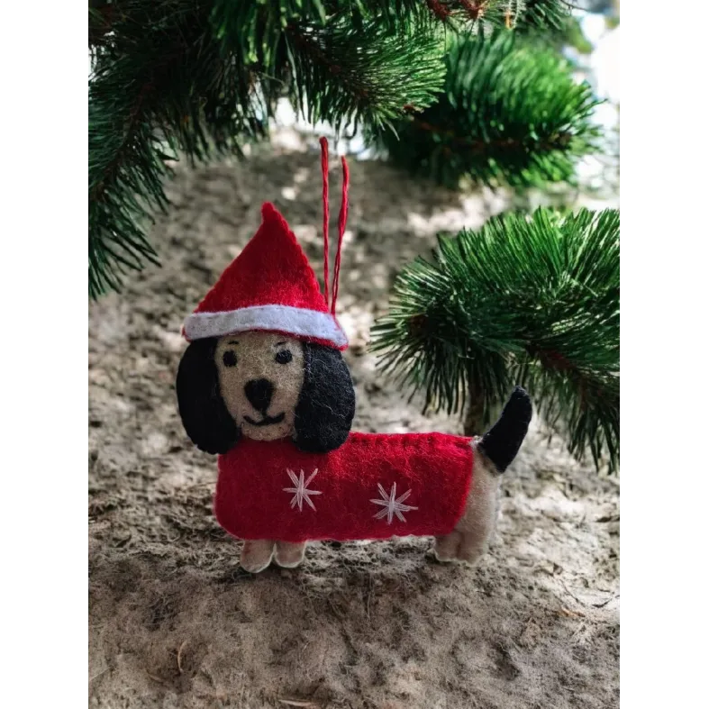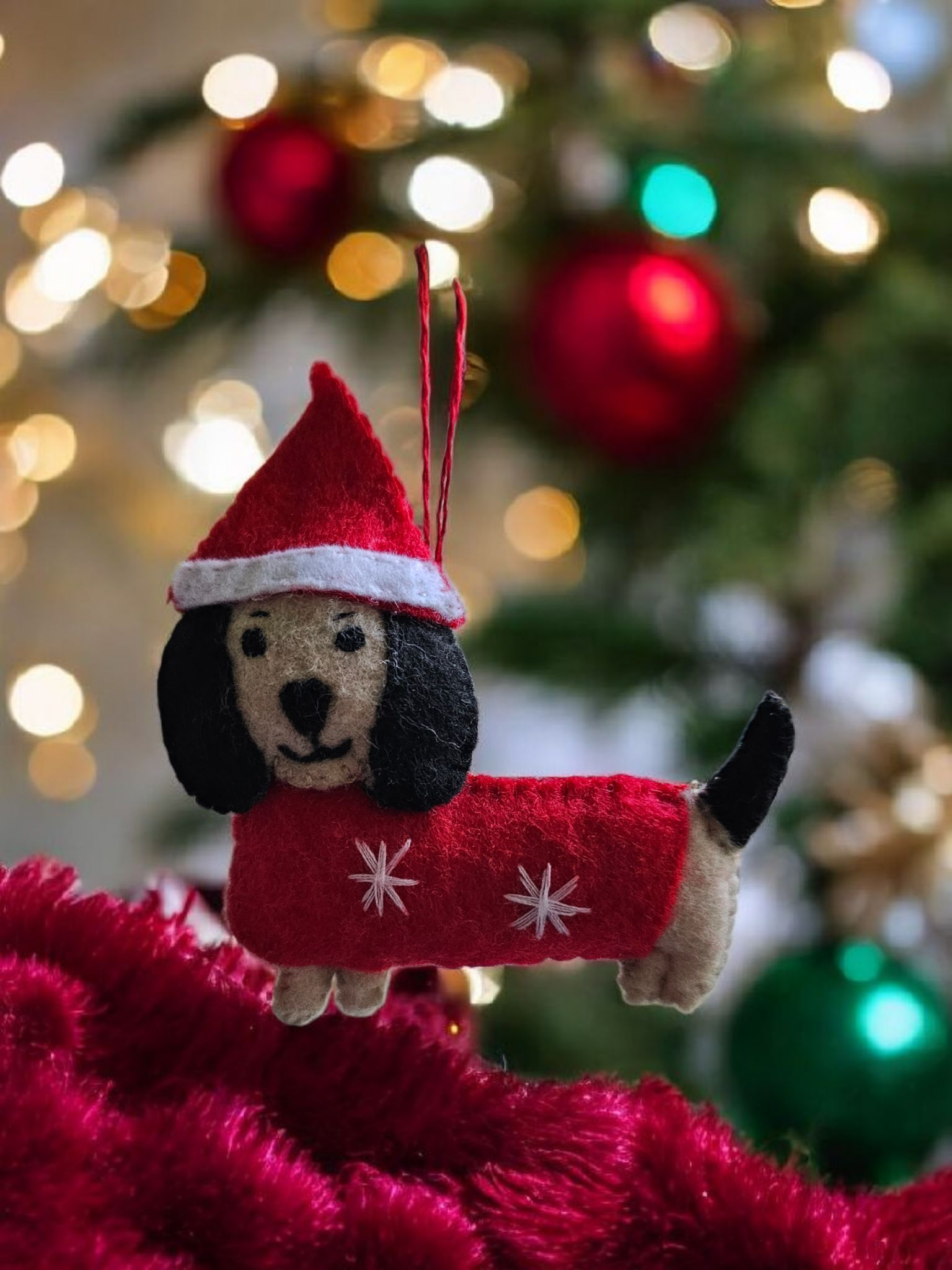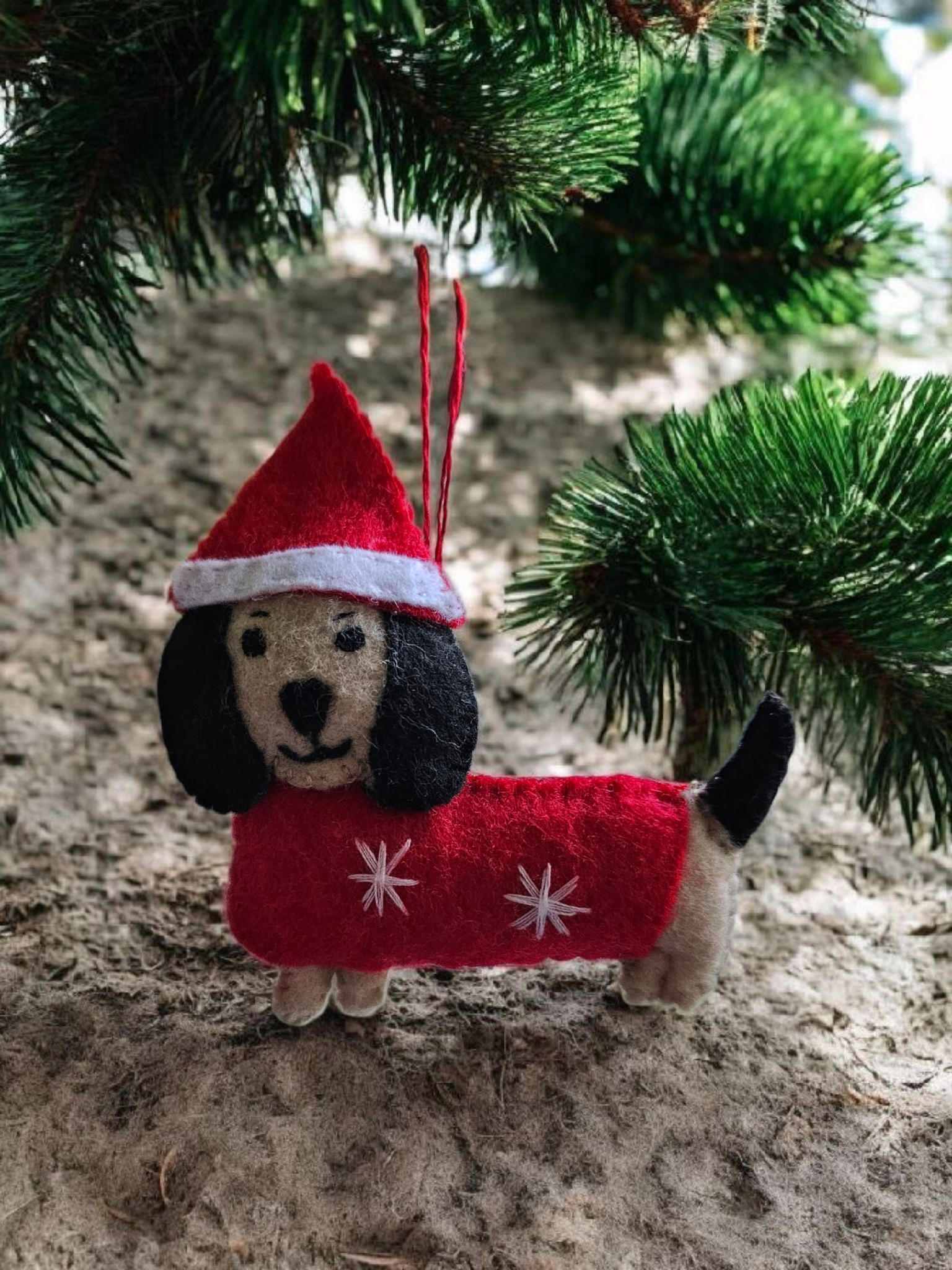 Un cățeluș drăguț pentru pomul de Crăciun! Este cusut manual din fetru și umplut cu puf hipoalergenic.