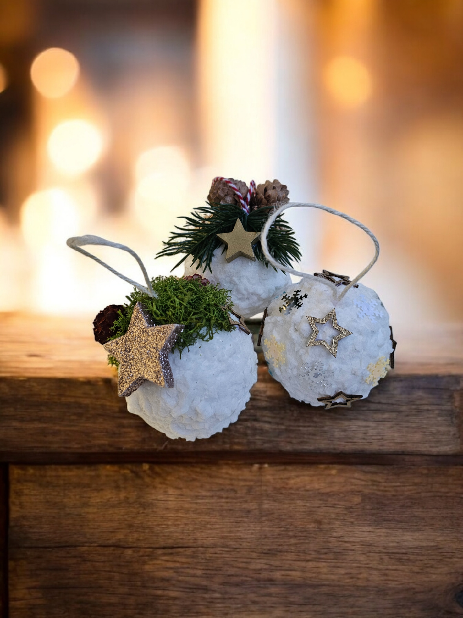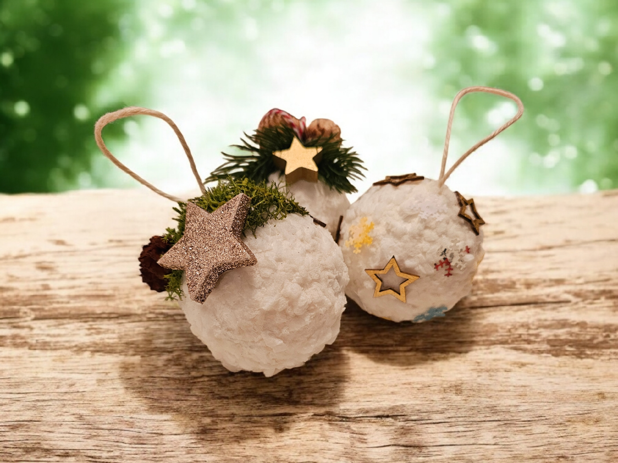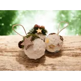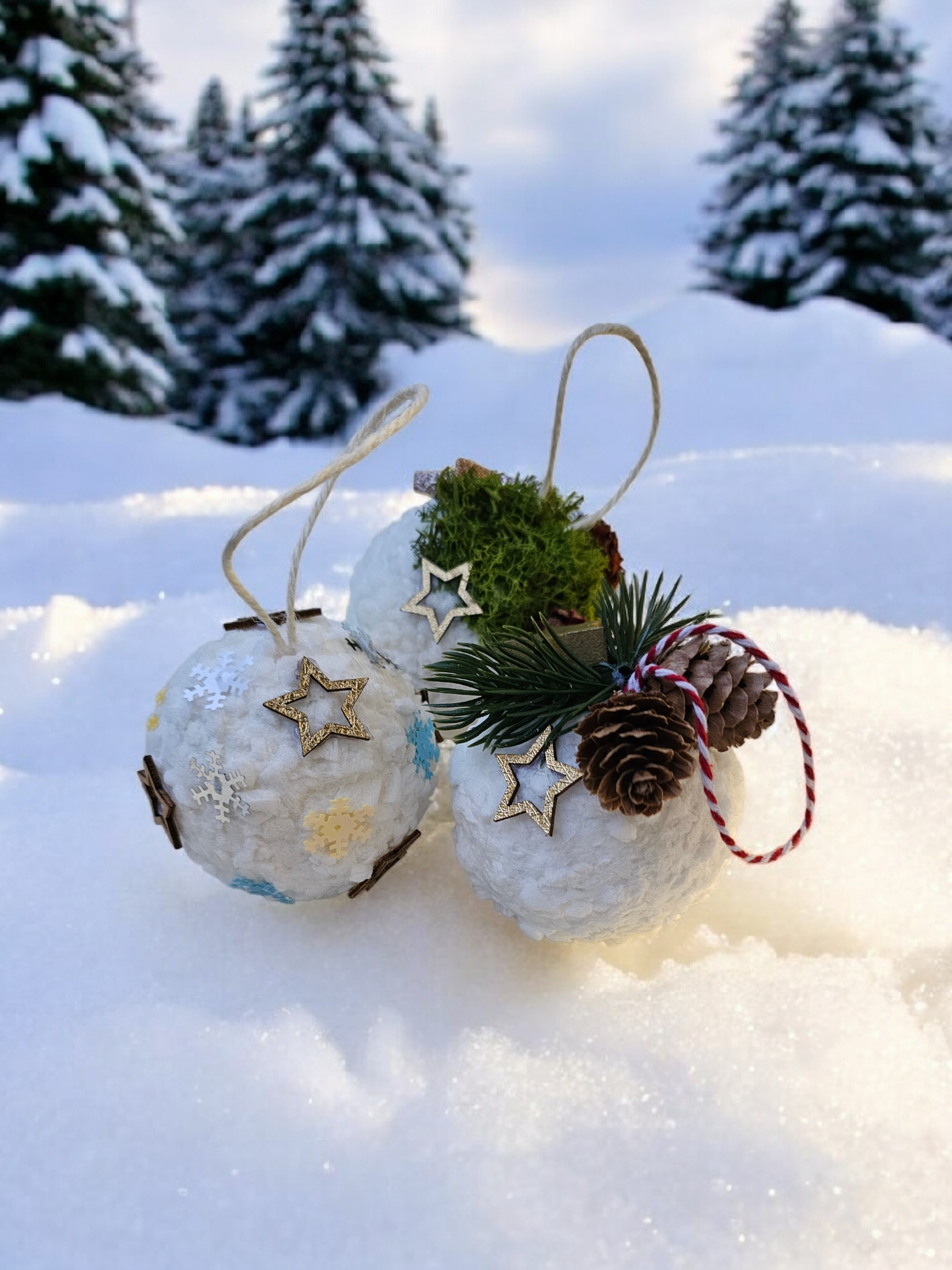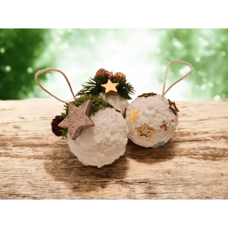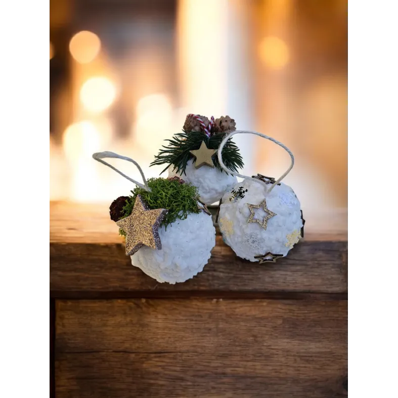 Globurile sunt lucrate manual pe bază de polistiren, sunt decorate cu zăpadă artificială și diverse ornamente - licheni, conuri, brad artificial și steluțe. Au diametrul de aproximativ 8 cm.