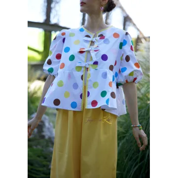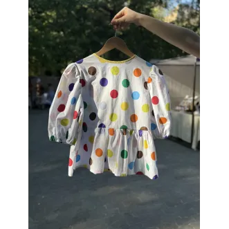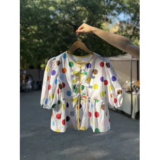 Bluza albă cu buline multicolore și mâneci bufante este atât confortabilă, cât și elegantă. Materialul 100% bumbac asigură respirabilitate și lejeritate, în timp ce imprimeul vesel adaugă un plus de personalitate ținutelor tale. Mărimi disponibile: 36 / S. Culoare: Alb cu buline multicolore. Material: 100% bumbac