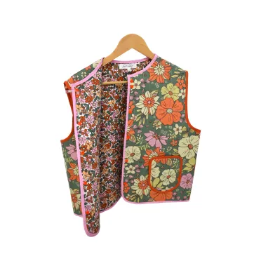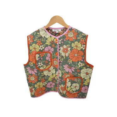 Vesta matlasată cu flori este alegerea ideală pentru o ținută de toamnă/primăvară veselă, feminină și plină de personalitate. Realizată din materiale confortabile și plăcute la purtare, această geacă se remarcă prin imprimeul floral viu, pentru un plus de stil și originalitate. Vestele noastre matlasate au o croială mai largă, perfectă pentru a fi purtate confortabil și peste un pulover gros. Design: Matlasat, imprimeu floral și margine roz Material: Exterior și interior 100% bumbac; căptușeală vatelină 100% poliester — perfectă pentru confort și căldură Mărimi disponibile: 40