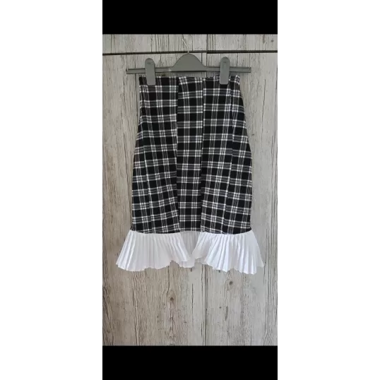 Fustă creion cu volane, realizata din materiale reutilizat de la o pereche de pantaloni si volanele sunt preluate de pe o cămașă pentru a sustine sustenabilitatea.