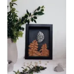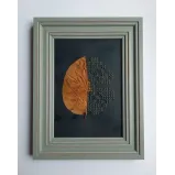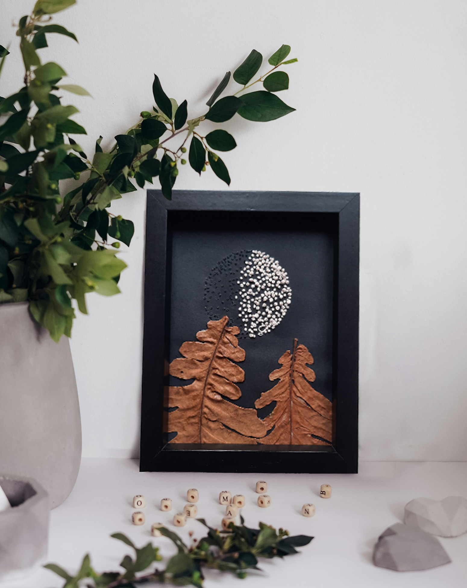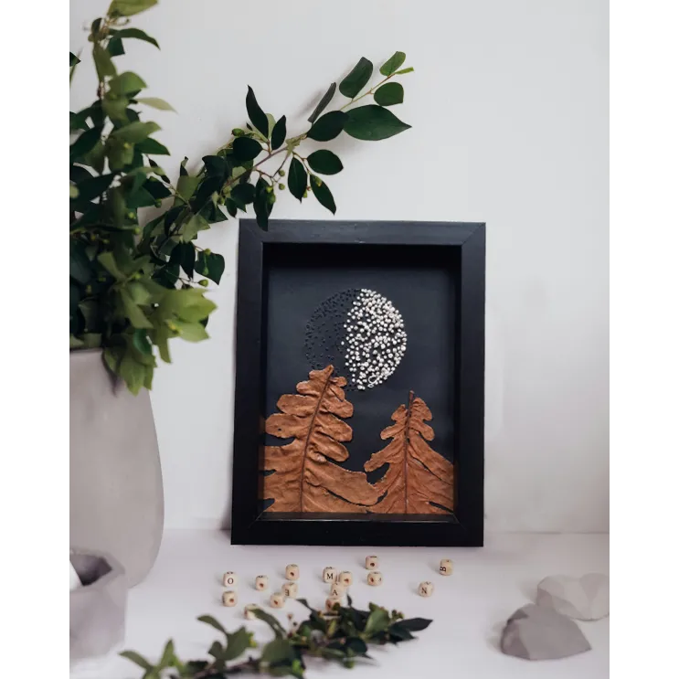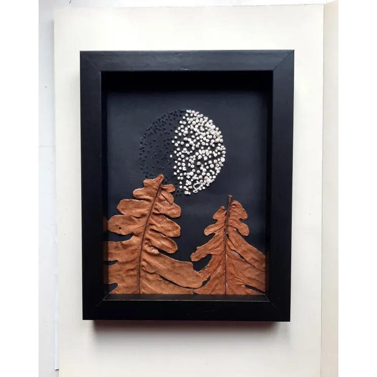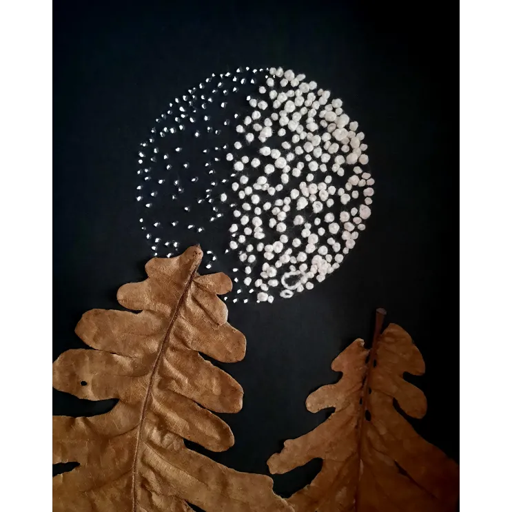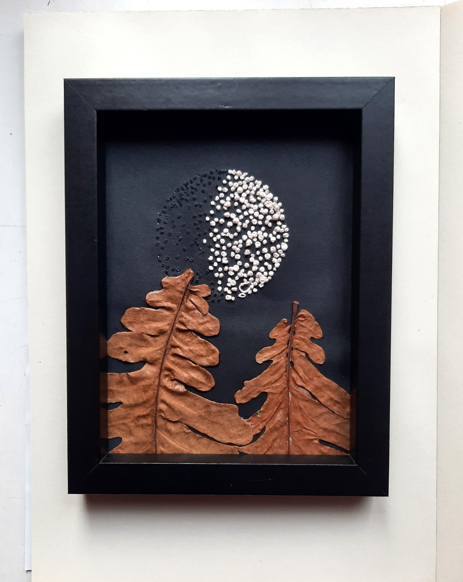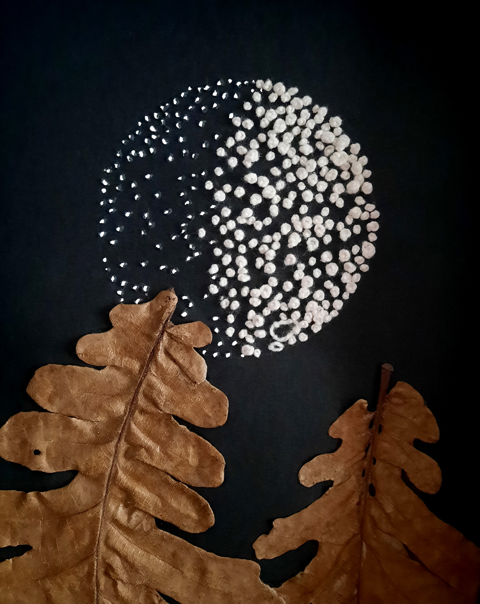 Mic tablou unicat, realizat manual din frunze de stejar, broderie și perforații de ac pe hârtie neagră.