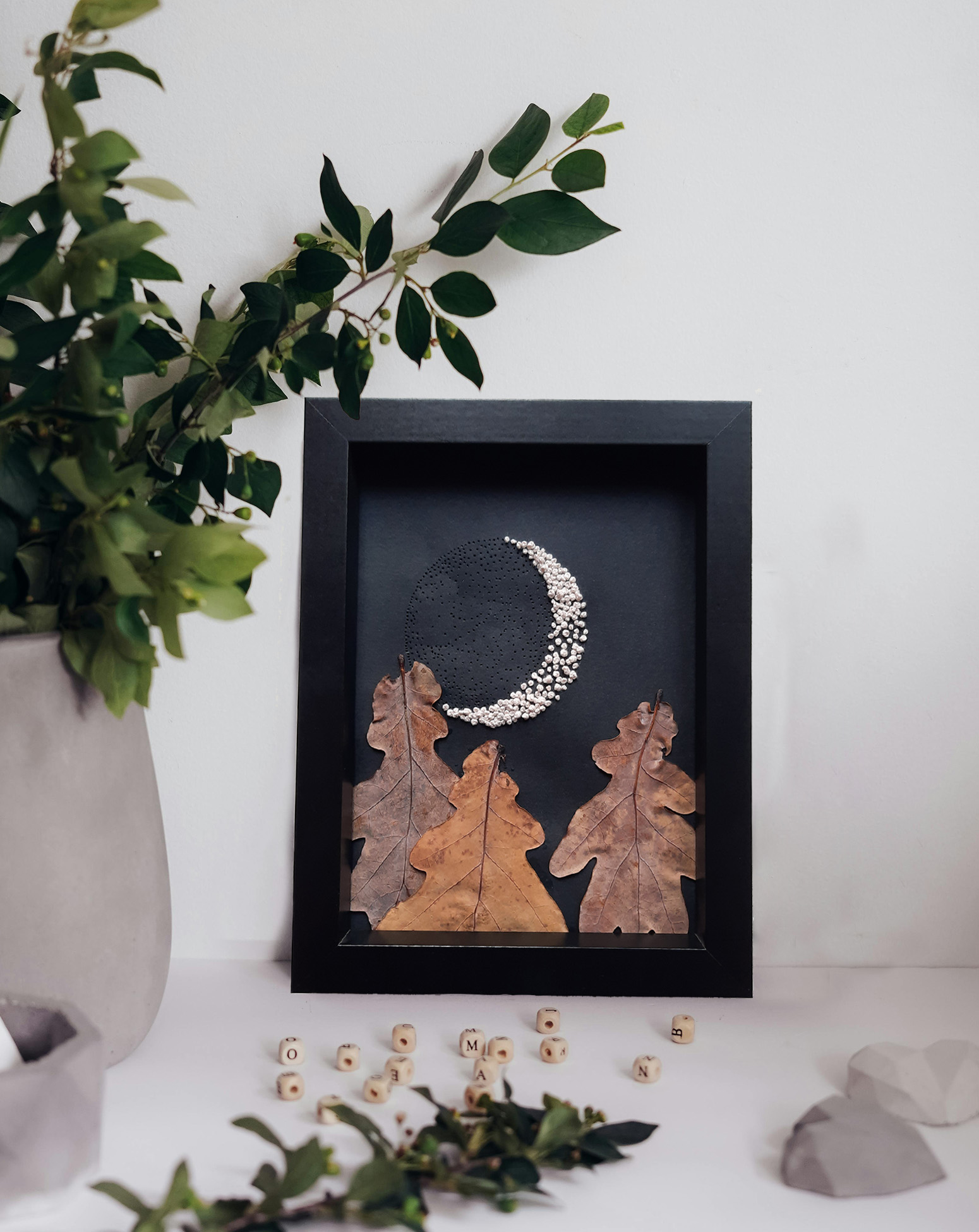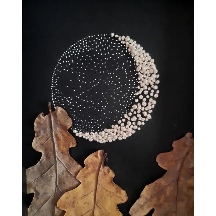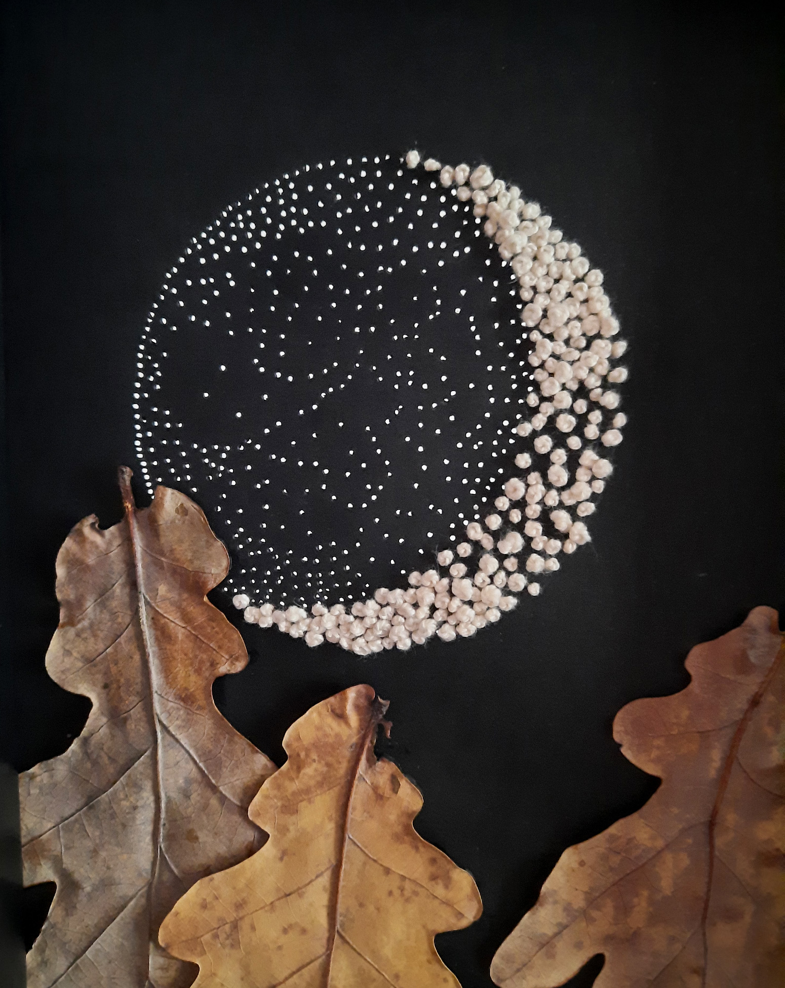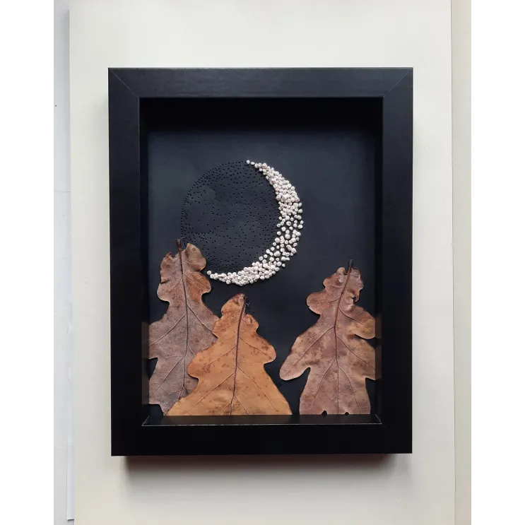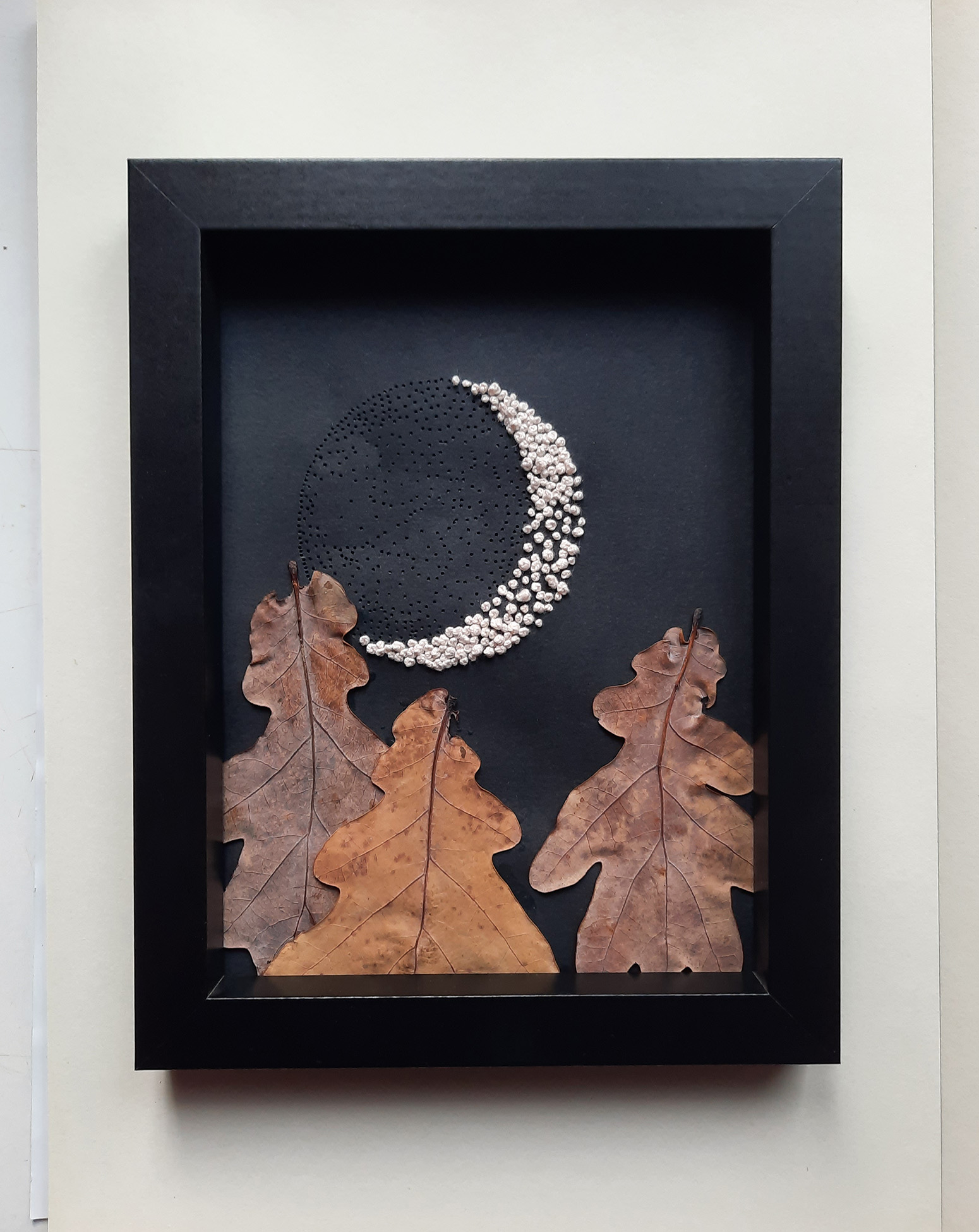 Mic tablou unicat, realizat manual din frunze de stejar, broderie și perforații de ac pe hârtie neagră.