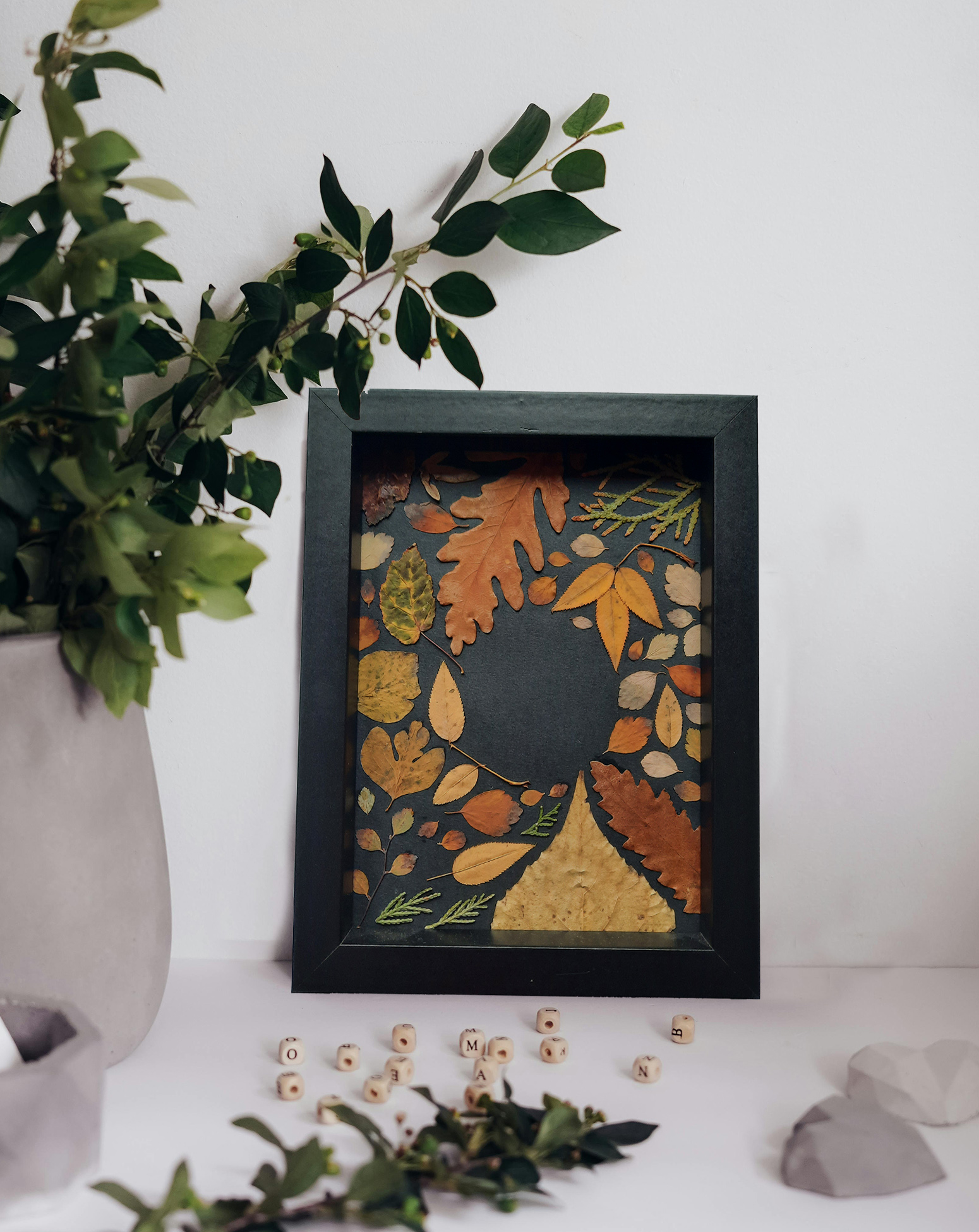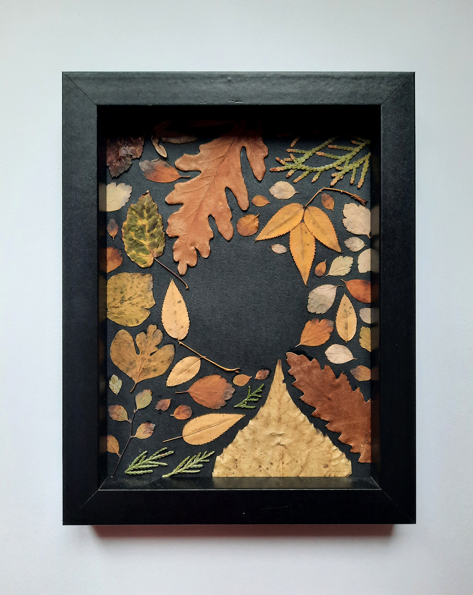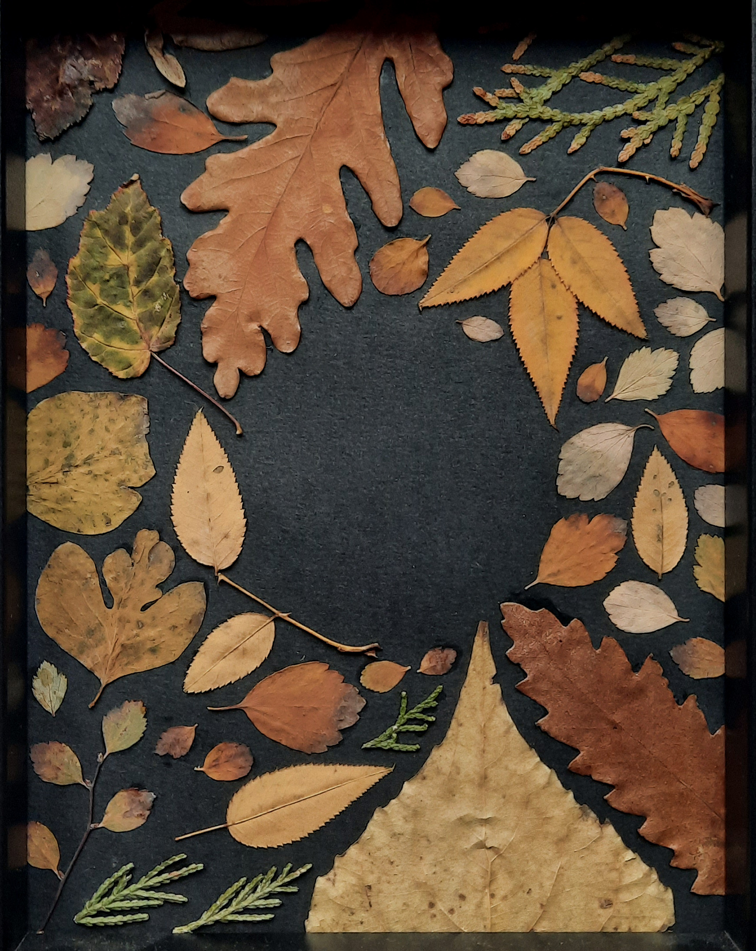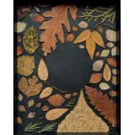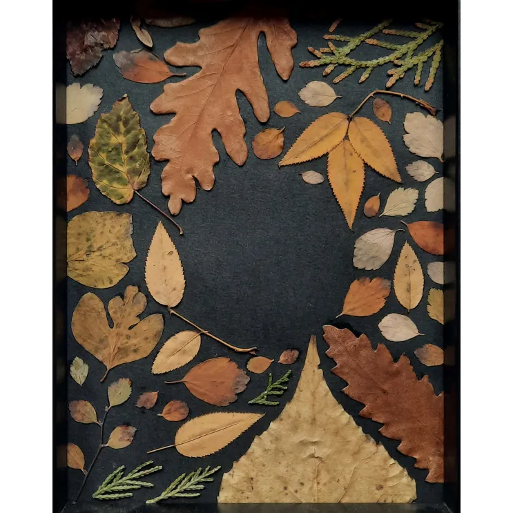 Tablou cu Luna nouă - faza în care nu o vedem - înconjurată de frunze de toamnă (plop, hibiscus, stejar, măceș, tuie, chiparos, cununa miresei). E ca un dans de toamnă în jurul Lunii... poate frunzele astea, desprinse de pe crenguțele lor ancorate pe pământ, au pornit într-un vârtej ușor, fermecat, spre Lună.