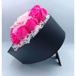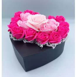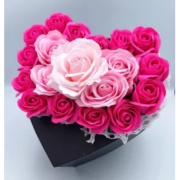 Acest aranjament floral rafinat este o declaratie de dragoste, creat din 19  trandafiri de sapun in nuante vibrante de siclam, roz si roz pastel, avand frumusetea naturala a trandafirilor proaspeti , dar cu avantajul durabilitatii florilor de sapun, ce nu se ofilesc niciodata. Aranjamentul este amplasat intr-o cutie in forma de inima, deschisa, care simbolizeaza iubirea si afectiunea profunda. Forma si designul cutiei adauga o nota romantica si eleganta. Intretinere : Florile de sapun trebuie tinute de departe de apa, razele soarelui si umiditate.