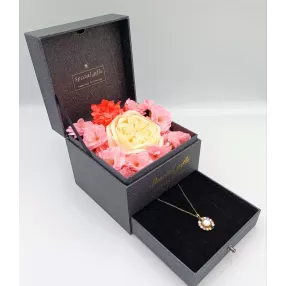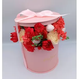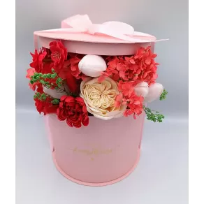 Aranjamentul floral include trandafiri din sapun, hortensie, lalele, flori de cires , flori de nufar si verdeata , toate prezentate elegant intr-o cutie rotunda roz cu capac. Aceste flori, combinate in culori delicate, ofera un aspect rafinat si romantic, fiind ideale pentru diverse ocazii, de la aniversari la cadouri deosebite. Cutia adauga un plus de eleganta, completand perfect aspectul sofisticat al aranjamentului. Intretinere: Florile de sapun trebuie tinute departe de apa, razele soarelui si umiditate, praf.