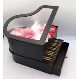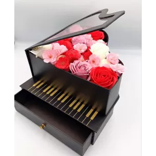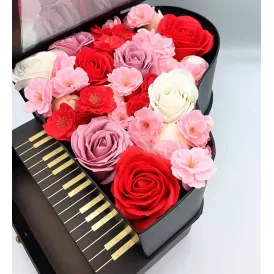 Acest aranjament floral spectaculos este o combinatie fascinanta de arta si eleganta , prezentat intr-o cutie in forma de pian, simbolizand armonia si frumusetea. Aranjamentul include trandafiri rosii , albi si mov pastel, lalele albe, flori de cires rosu si roz. Designul cutiei in forma de pian nu doar ca atrage privirile, dar si ofera o nota de originalitate si creativitate, fiind cadoul perfect pentru pasionatii de muzica. Intretinere: Florile de sapun trebuie tinute departe de apa, razele soarelui si umiditate. Lungime 27cm , latime 24 cm, inaltime 16 cm.