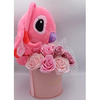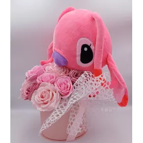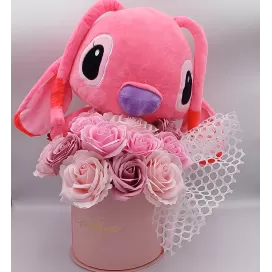 Un aranjament de trandafiri din sapun in culori pastelate , combinat cu un plus Stitch , poate fi o alegere originala si atractiva, ideala pentru cadouri sau decor. Aranjamentul va include trandafiri din sapun  in mai multe nuante : galben, albastru, alb si roz. Adaugarea unui plus Stitch ofera un element de joaca si distractie. Acest aranjament este perfect ca un cadou pentru diferite ocazii, cum ar fi zile de nastere, aniversari sau simple gesturi de apreciere, deoarece combina frumusetea florilor cu farmecul unui personaj indragit.