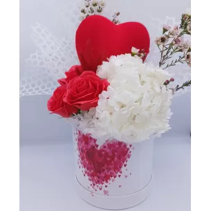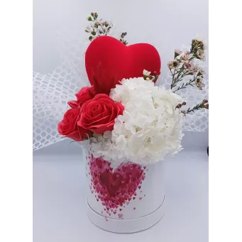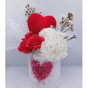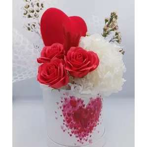 Aranjamentul floral consta in trandafiri din sapun rosii si  hortensii albe accesorizate cu o inimioara rosie dragalasa , prezentate intr-o cutie rotunda alba decorata cu un model elegant realizat prin tehnica decoupage. Acesta combinatie aduce un aer elegant si rafinat, fiind perfecta pentru ocazii speciale cum ar fi aniversari sau evenimente corporatiste. Trecerea de la florile delicate la cutia sofisticata transforma acest aranjament intr-un cadou memorabil.