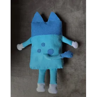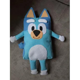 Bluey cusut integral manual, din fetru, iar în interior umplut cu puf hipoalergenic. Are lungimea totală de 34 cm, lățimea la brațe 26 cm, lățimea corpului 14 cm. Poate fi folosit și ca pernă decorativă. Se poate spăla în mașina de spălat, la un program scurt sau pentru haine delicate. Nu se recomandă frecarea.