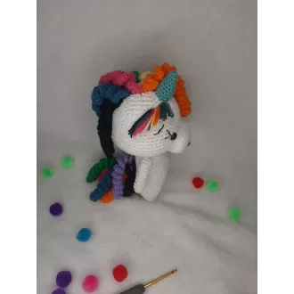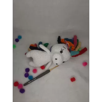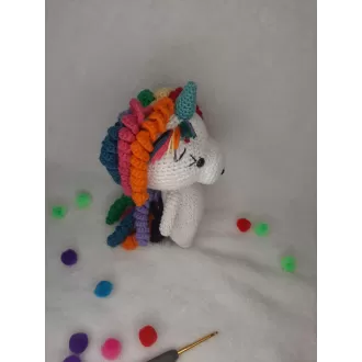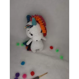Jucăria unicorn croșetată este o păpușă colorată, cu un corp moale și fluffy, perfectă pentru îmbrățișat. Are o coamă strălucitoare în nuanțe de roz, violet și albastru, și un corn auriu care îi aduce un strop de magie. Detaliile lucrate manual, precum ochii mari și zâmbetul prietenos, fac din acest unicorn companionul ideal pentru cei mici, oferindu-le ore de joacă plină de imaginație!