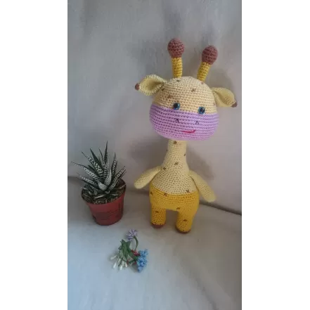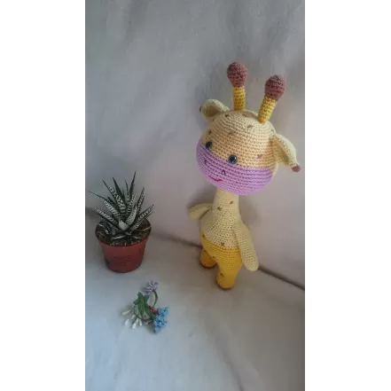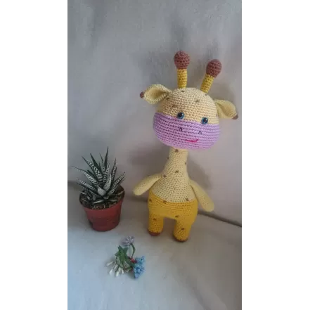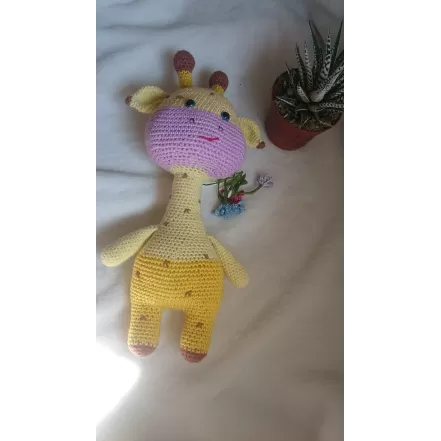Girafa croșetată este o jucărie adorabilă, cu un corp pufos și agile, perfectă pentru îmbrățișări. Are un design jucăuș, cu pete maronii pe un fond galben strălucitor, gât lung și ochi zâmbitori care transmit căldură. Detaliile croșetate cu grijă subliniază trăsăturile sale prietenoase, făcând-o un companion ideal pentru joacă sau decor pentru camera celor mici. Această girafă este nu doar o jucărie, ci și o prietenă de nădejde!