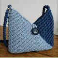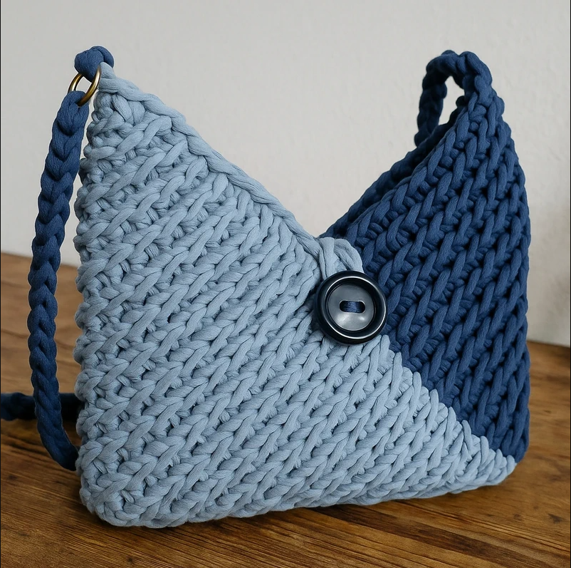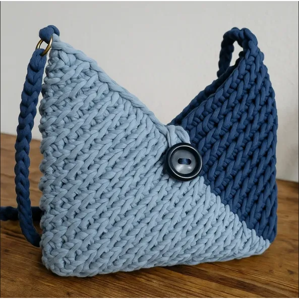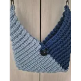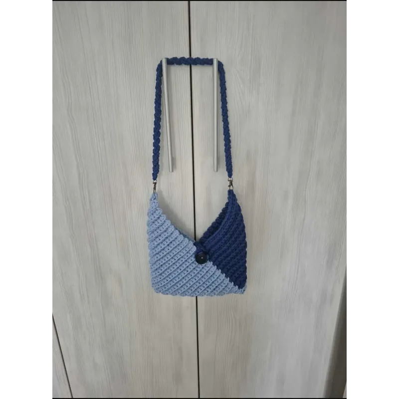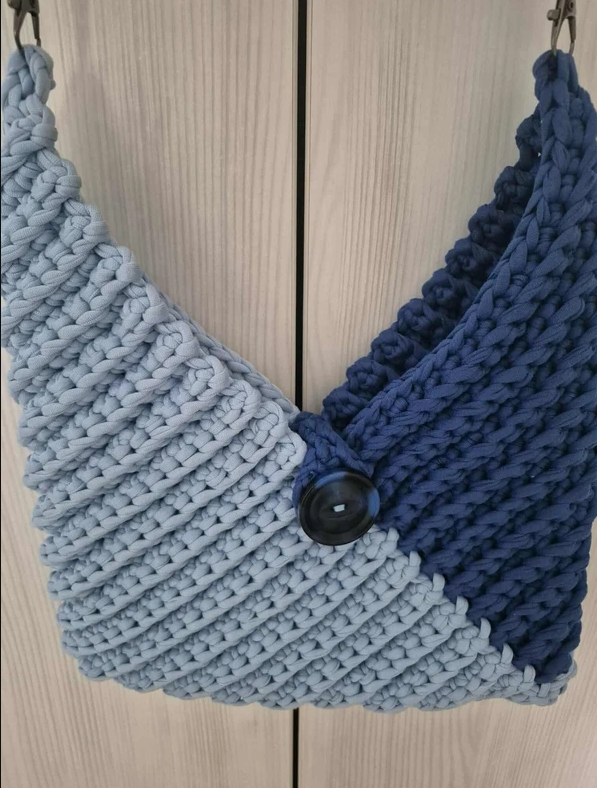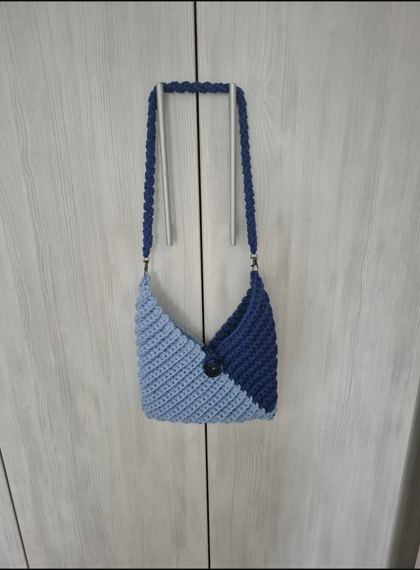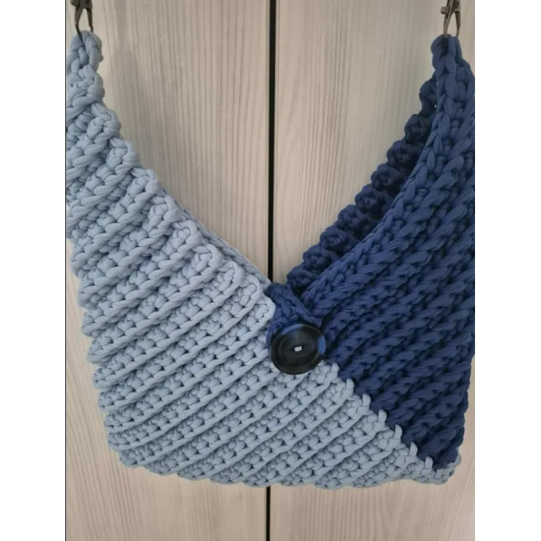 Geantă realizată manual din fir tip T-shirt yarn gros și rezistent, în două nuanțe elegante de albastru. Model texturat, cu închidere prin nasture mare și curea împletită solidă.