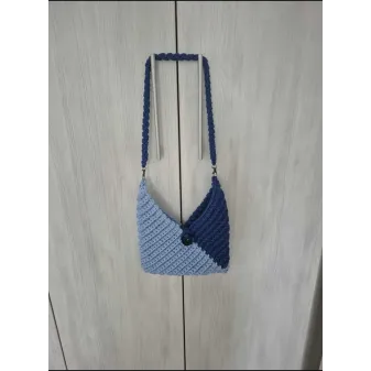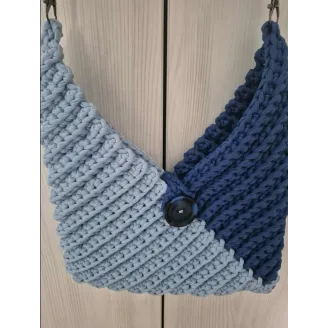 Geantă realizată manual din fir tip T-shirt yarn gros și rezistent, în două nuanțe elegante de albastru. Model texturat, cu închidere prin nasture mare și curea împletită solidă. Culoare: albastru deschis & bleumarin Material: fir T-shirt din plastic reciclat Lățime: aprox. 25 cm Înălțime (în centru): aprox. 19 cm Lungimea curelei: aprox. 45 cm Închidere: nasture