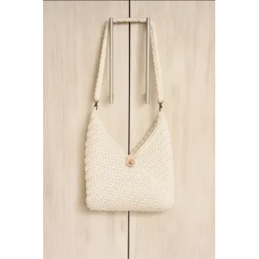 Geantă croșetată manual, realizată din fir gros tip T-shirt yarn din plastic reciclat, ușoară, dar rezistentă. Culoarea albă o face ușor de asortat la orice ținută – perfectă pentru vară, plimbări sau un look casual elegant. Culoare: alb Material: fir T-shirt din plastic reciclat Lățime: aprox. 25 cm Înălțime (în centru): aprox. 19 cm Curea de umăr: aprox. 40 cm