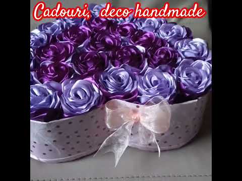 Aranjamentul cu flori din satin in doua nuante de mov, este realizat manual 100% intr-o cutie din carton confectionata manual, frumos decorata cu o fundita din organza si fluturasi.