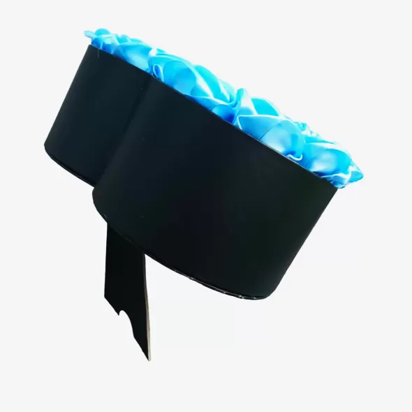 Aranjament floral realizat din flori din satin (alcatuite petala cu petala) usor parfumate, intr-o cutie neagra cu suport ce permite asezarea lui si vertical si orizontal.