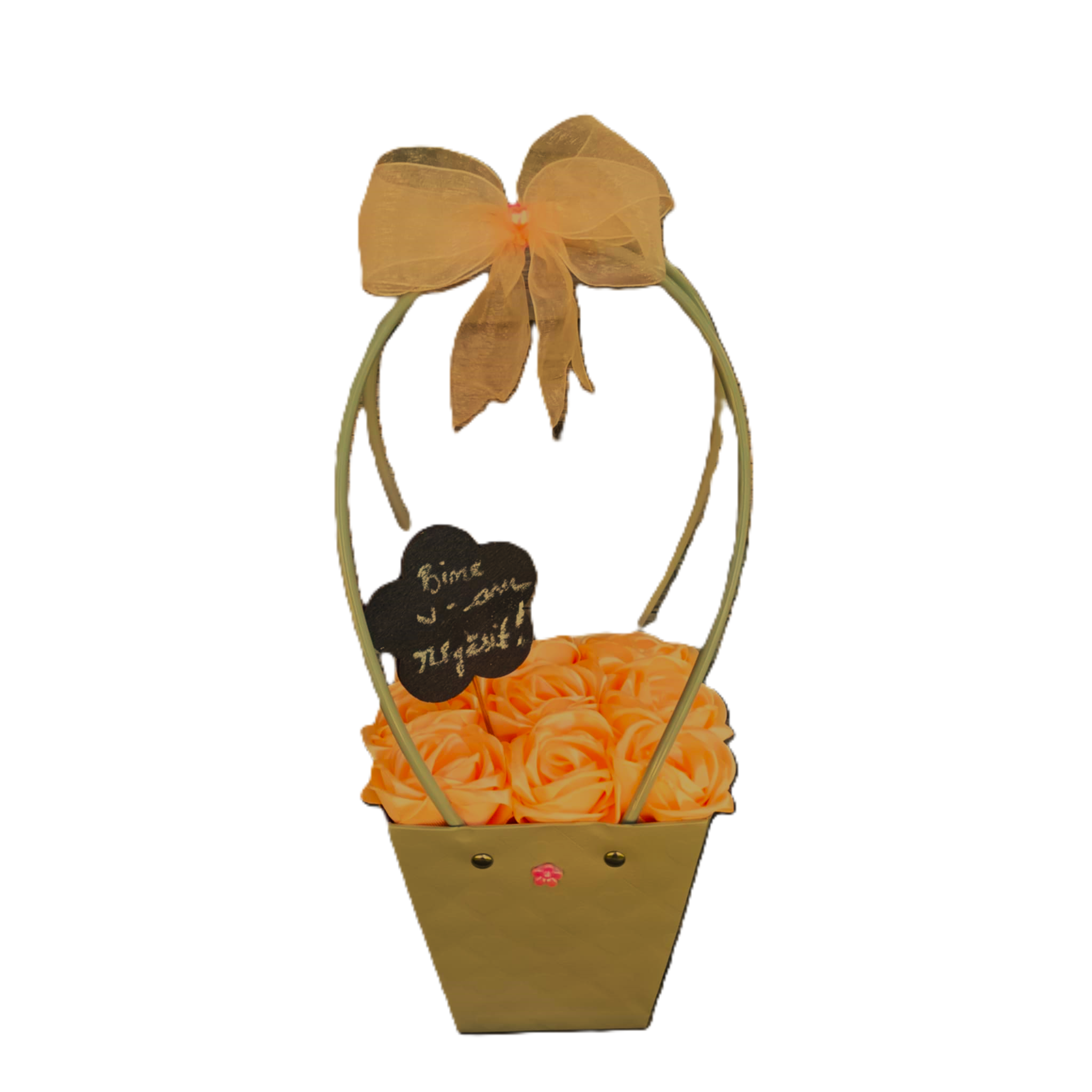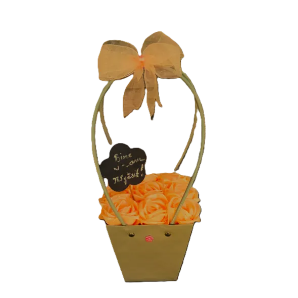 Un aranjament floral in punga din carton, decorata cu 9 trandafiri din satin roz-somon potriviti pentru orice ocazie.