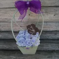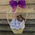 Un aranjament floral in punga din carton, decorata cu 9 trandafiri din satin lila, potriviti pentru orice ocazie.