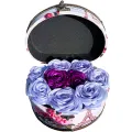 Cufarul din piele ecologica este frumos decorat cu 9 trandafiri catifelati din satin, usor parfumati, realizati manual, in doua nuante de mov.