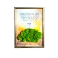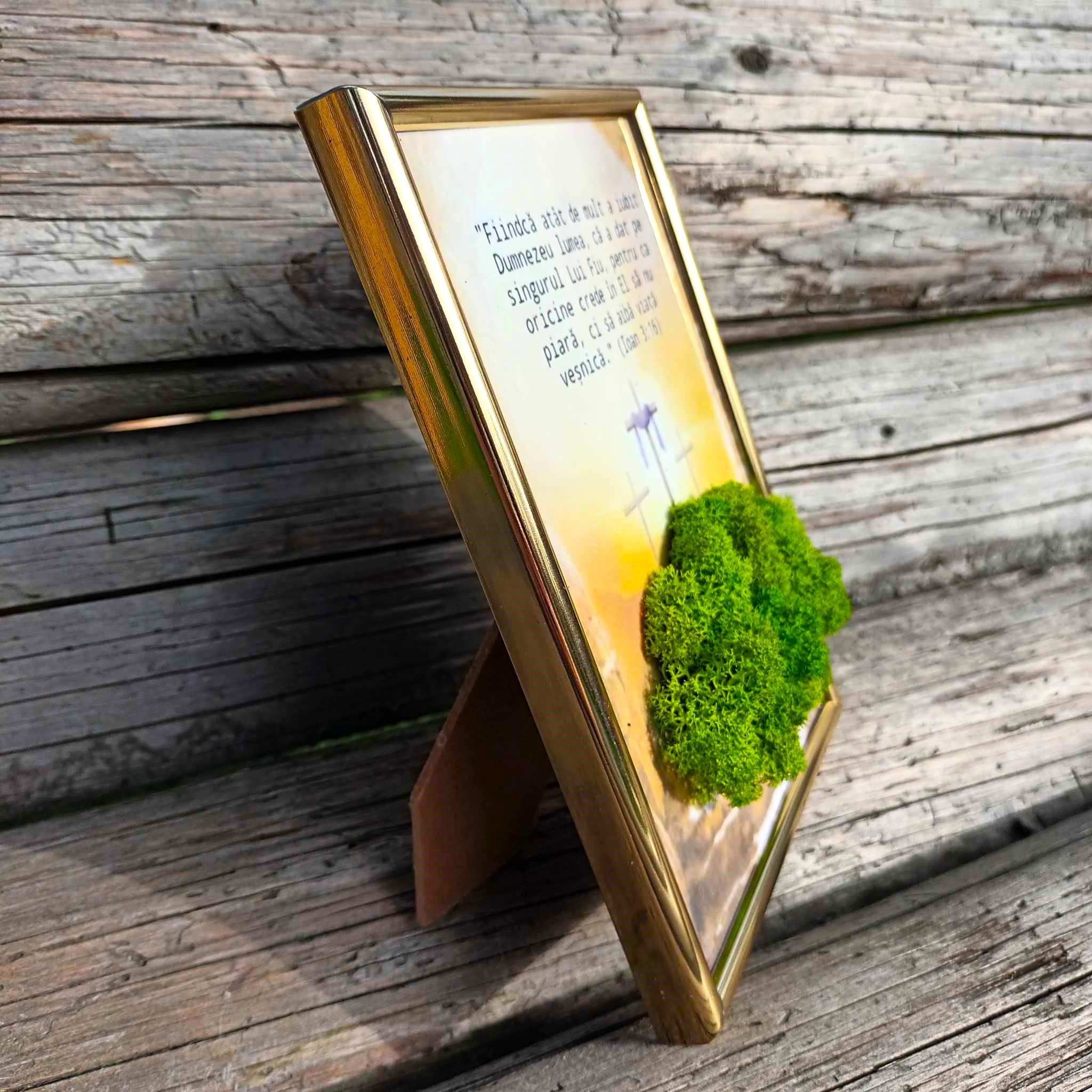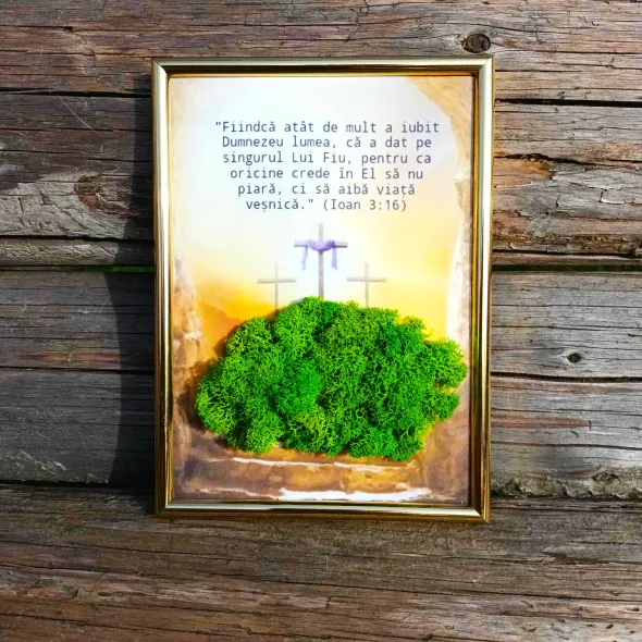 Tabloul cu licheni stabilizati de culoare verde deschis, cu text verset din Biblie (Ioan 3:16) si rama de plastic dur, este cadoul perfect pentru Sarbatorile Pascale, dar si pentru orice alta ocazie.