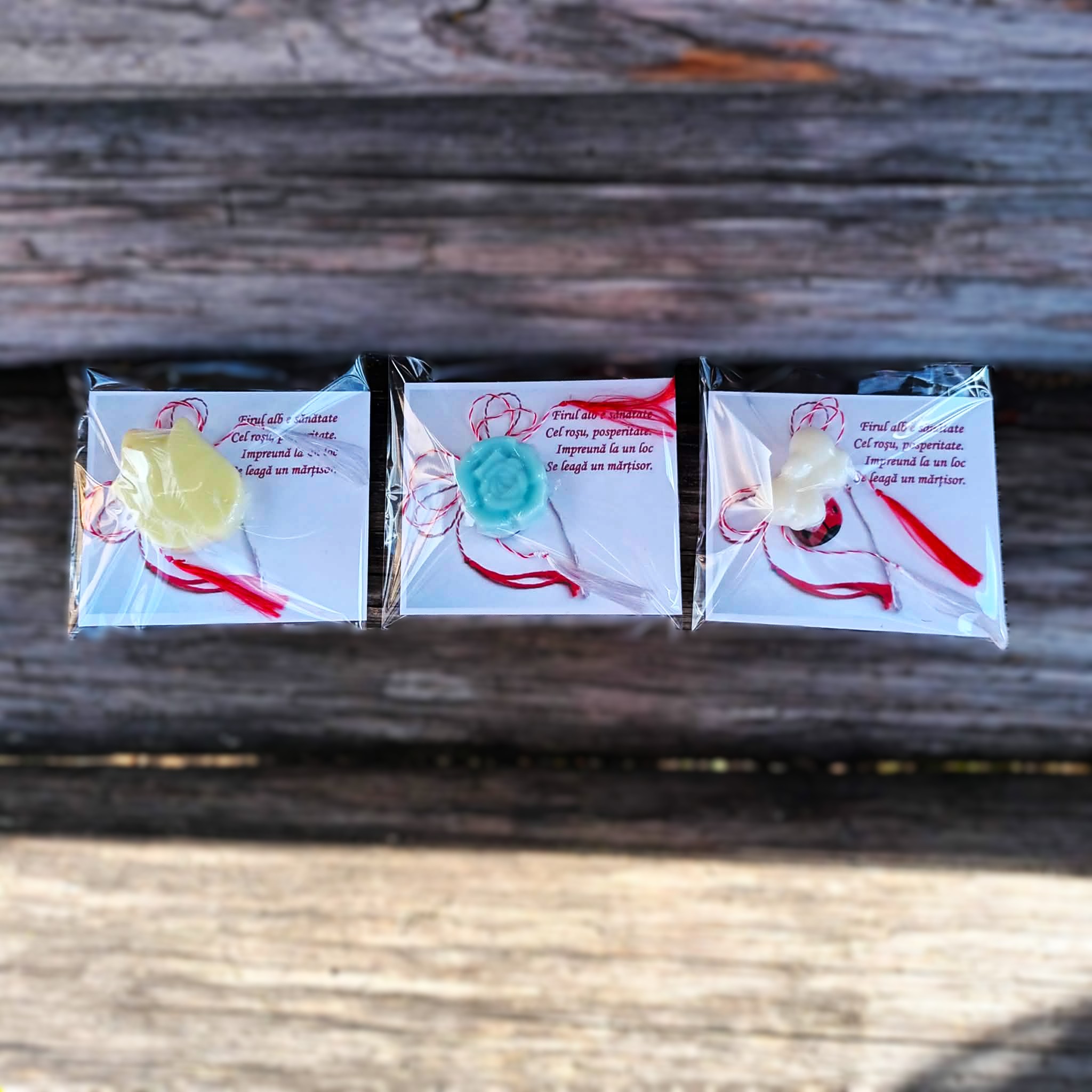 Un set format din 3 martisoare din ceara naturala de soia parfumata, pe un carton personalizat cu mesaj de martisor, ambalate individual.