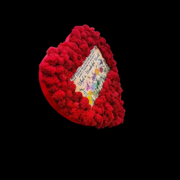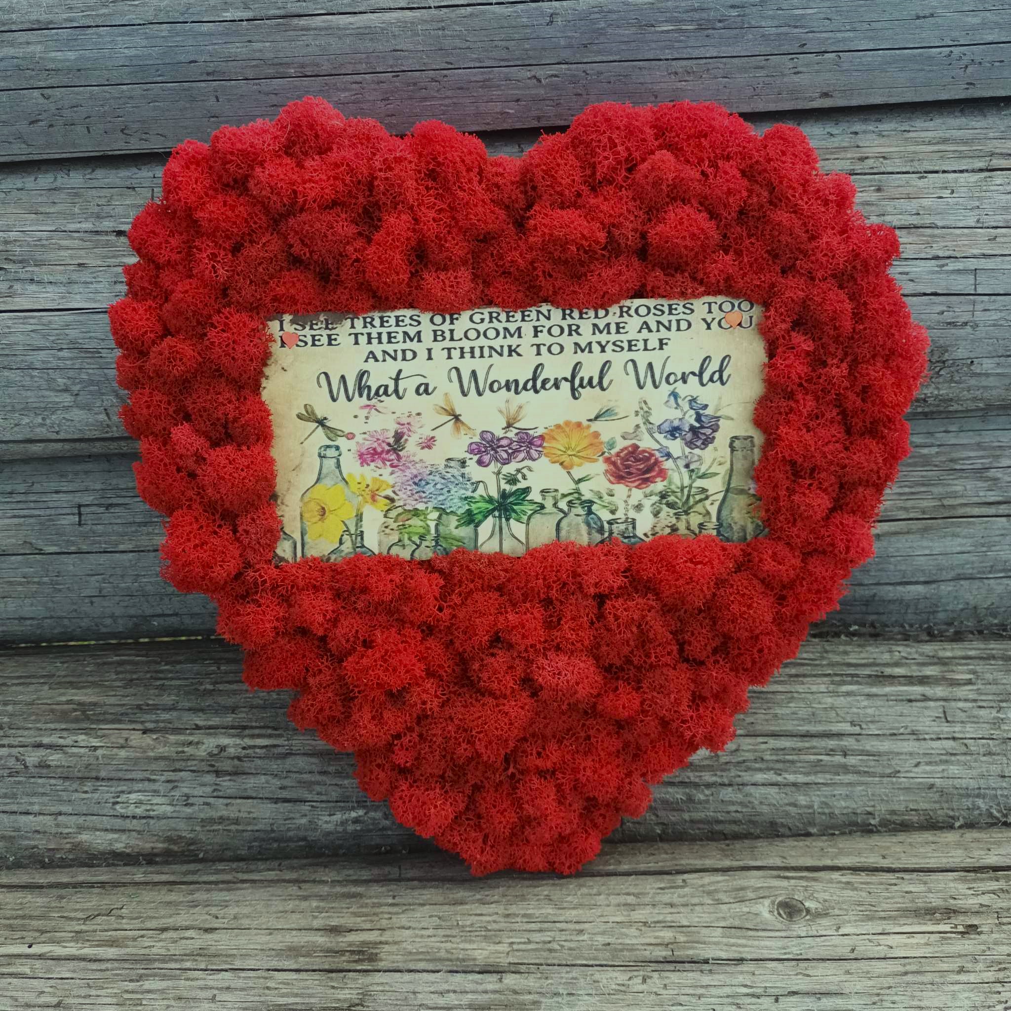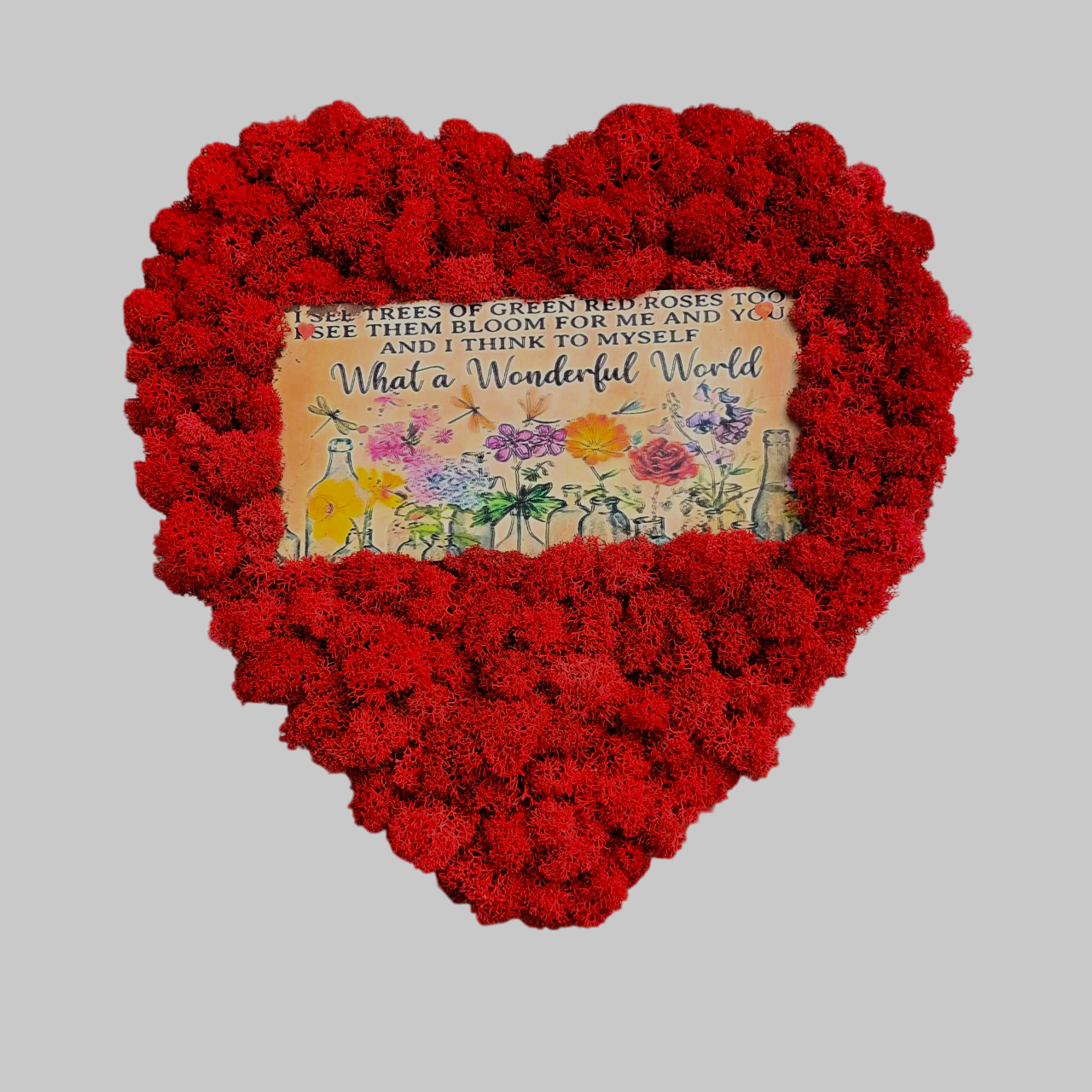 Decoratiunea este lucrata manual pe un suport din panza, in forma de inima cu licheni stabilizati, in centru avand un suport din lemn frumos decorat cu flori si inscriptionat cu celebrele versuri ale cantecului ”What a Wonderful World”, interpretat de Loius Amstrong: