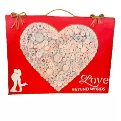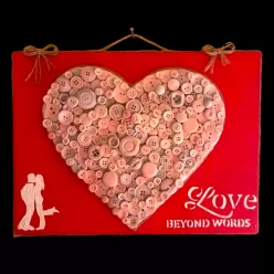 Un tablou 30x40 cm, lucrat manual pe panza si carton, cu acrilice, iuta si nasturi.  Ideal pentru a fi daruit cadou jumatatii tale, indiferent de ocazie, un mod mai special de a-ti arata iubirea, sau de a sarbatori dragostea. Mesajul in limba engleza, care tradus inseamna „ Dragostea dincolo de cuvinte ” completeaza minunatul decor si-i ofera  personalitate , facand din tablou un  cadou unic  ce va incanta privirile ani la rand. In functie de lumina din interior/exterior, pozele surprind tonuri si nuante ce il pun in evidenta.