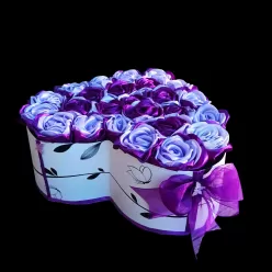 Aranjamentul cu flori din satin in doua nuante de mov, este realizat manual 100% intr-o cutie din carton confectionata manual, frumos decorata cu o fundita din organza si fluturasi. Catifelati si usor parfumati, trandafirii din satin vor trai vesnic si vor incanta privirea celor dragi. Ce cadou poate fi mai inspirat decat acest aranjament de care te poti bucura la nesfarsit? Indiferent de ocazie, minunatii trandafiri sunt mereu alegerea potrivita!