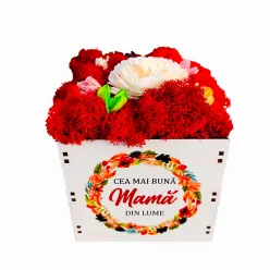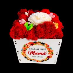 Aranjamentul este creat din licheni naturali stabilizati rosii, plante uscate colorate (Bakuli) si o floare Ming alba, intr-o cutiuta de lemn gravata cu un minunat mesaj pentru mama. Florile din lemn Sola cunoscute si „Flori ming” sunt niste ornamente superbe din lemn, realizate manual, fiind si foarte prietenoase cu mediul. Lemnul de Sola, materialul utilizat pentru a confectiona aceste fantastice elemente de decor, este durabil, dar si foarte fin, provenind din scoarta plantei de Sola (Aeschynomene aspera). Ofera-i mamei tale un coltisor de natura impreuna cu toata dragostea ta! Florile si lichenii stabilizati nu necesita...