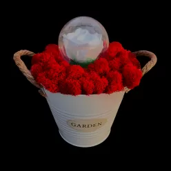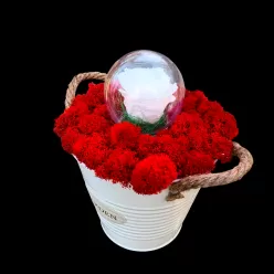 Aranjamentul cu licheni naturali stabilizati,  este realizat intr-o galetusa metalica, in centru avand un  trandafir criogenat  (floare naturala care a fost supusa unui proces de conservare, pastrandu-si proprietatile naturale ani intregi) intr-o cupola mica din plastic, ce il va feri de praf si il va pastra in stare perfecta mult timp. Ofera un cadou inspirat, un aranjament ce nu va muri niciodata, o parte din natura de care oricine se va bucura la nesfarsit! Veti primi impreuna cu acest aranjament mai multe informatii despre licheni dar si cum se pastreaza ei in cele mai bune conditii.