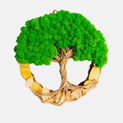O decoratiune de perete realizata manual din rondele de lemn, sfoara si licheni stabilizati de culoare verde. Copacul vietii , pe care il reprezinta acest decor, este unul dintre cele mai bogate si raspandite  simboluri .  Copacul Vietii, Arborele sau Pomul Vietii  este un  copac mistic, magic, un simbol sacru  foarte bine cunoscut in multe culturi, ce dateaza din cele mai vechi timpuri. Diferite popoare si religii i-au atribuit diverse nume, fiecare popor avand propriul copac al vietii in mitologia sa.  Semnificatia Copacului Vietii  ramane insa una si aceeasi –  sursa de viata , in fiecare cultura. Copacul Vietii  ne invata...