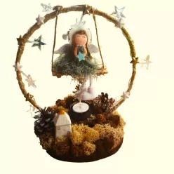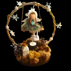 Decoratiune unicat, realizata pe felie de lemn, cu licheni naturali stabilizati si diferite ornamente de Craciun. Ingerasul este textil, suportul pentru lumanarea cu led (lumanare ce imita flacara normala, palpaind). este din metal, ceea ce ii da aranjamentului un aer usor vintage. Ingerasul este inconjurat de o instalatie cu beculete in forma de stelute, ce dau un aspect aparte decoratiunii. Bateriile necesare instalatiei sunt incluse, astfel ca va veti putea bucura de ea din primul moment. In partea din stanga se regasete, din ceamica, si o casuta, iar conurile de brad, presarate pe alocuri, completeaza frumos peisajul. Fiind realizata...