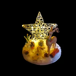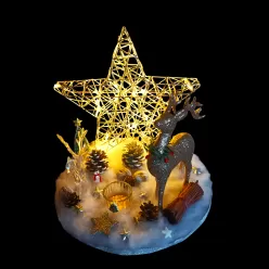 Un  aranjament  ideal pentru masa de  Craciun , realizat manual, presarat cu zapada artificiala 2 reni, conuri de brad, stelute, o stea mare cu beculete (bateriile ei sunt incluse, astfel ca va veti putea bucura imediat de aranjament). In suportul de sticla din fata, veti avea o lumanare in forma de bradut (inclusa in pret), pe care o veti putea inlocui ulterior cu ce doriti. Ofera-l cadou sau bucura-te chiar tu de frumusetea aranjamentului unicat! Fiind un produs realizat manual, fiecare produs va fi usor diferit, neputand fi reprodus 100%, astefel ca vor putea fi foarte mici diferente de dimensiuni si decoratiuni.