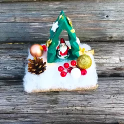 Un aranjament ideal pentru masa de Craciun, realizat pe o placuta de lemn, cu zapada artificiala, globulete zglobii multicolore, conuri de brad si un bradut din ceramica turnat si pictat manual, impodobit cu beculete care au si baterii incluse, gata de utilizare. Ofera-l cadou sau bucura-te chiar tu de frumusetea aranjamentului unicat! Fiind un produs realizat manual, fiecare produs va fi usor diferit, neputand fi reprodus 100%. Dimensiunile si decoratiunile pot varia foarte putin.