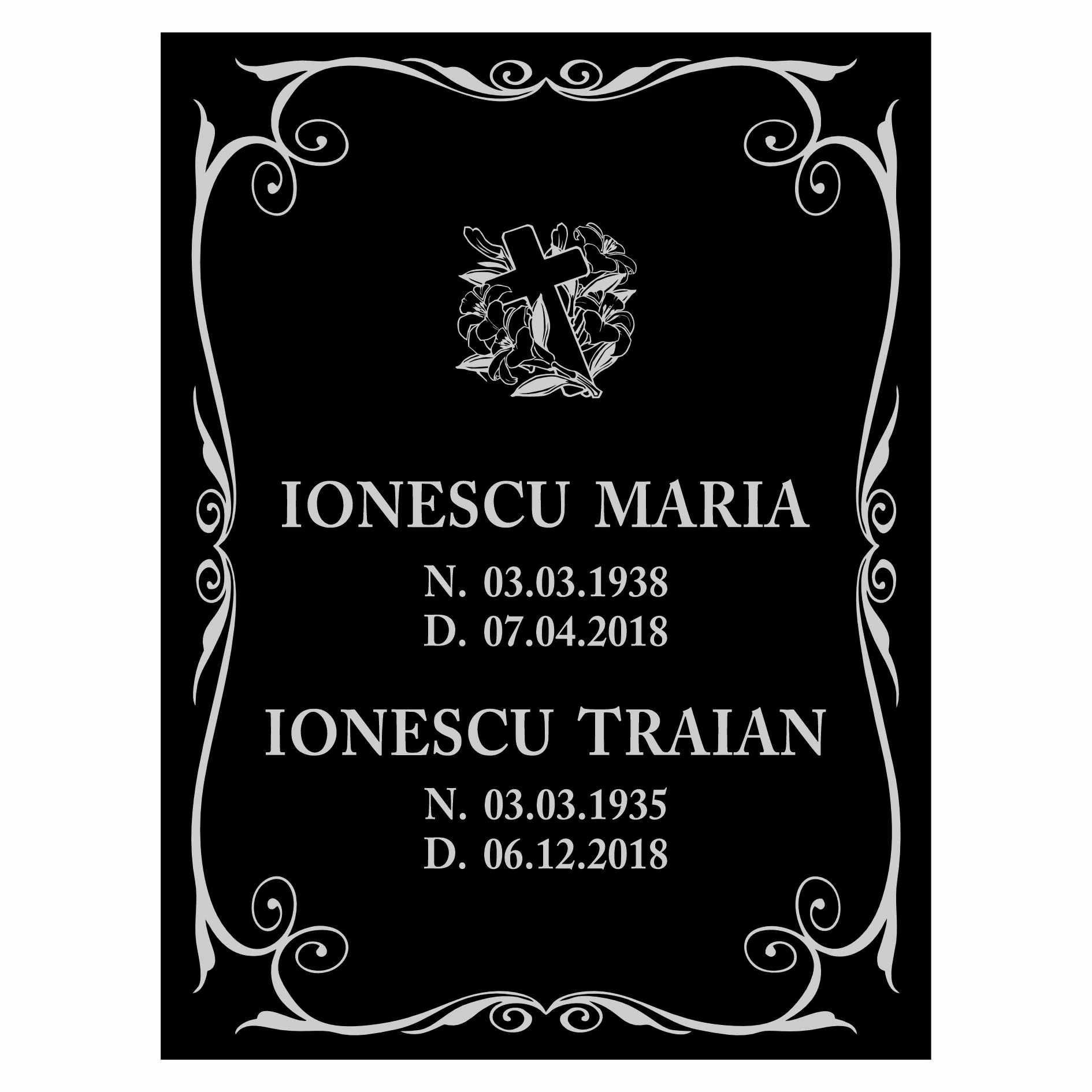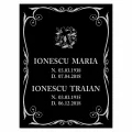Placa funerara aluminiu eloxat negru, gravata si marcata cu laser, rezultand un marcaj de nuanta alba.