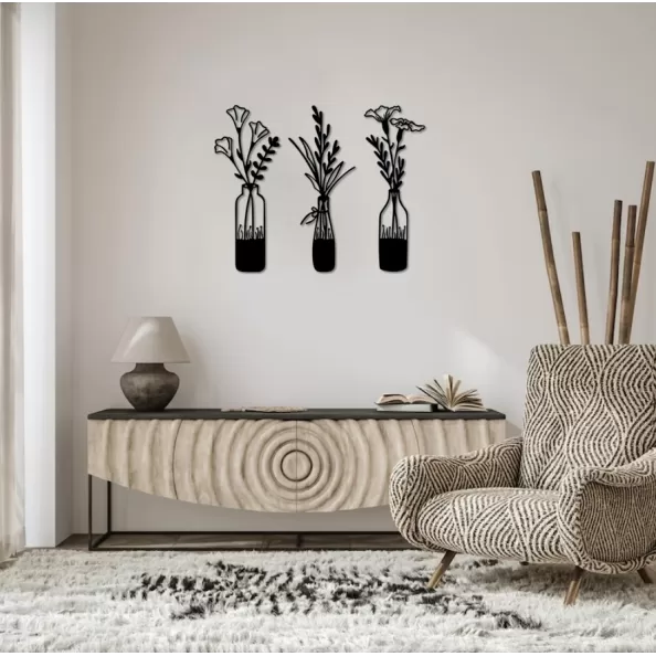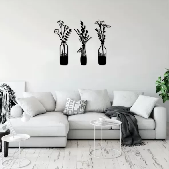 Aceste trei siluete elegante prezintă vaze cu flori stilizate, aducând un farmec artistic și modern oricărui spațiu. Designul delicat al florilor și contrastul dintre negrul siluetelor și fundalul luminos transformă orice perete într-un punct de atracție vizuală. Comandă-le pentru a aduce o notă de natură și rafinament decorului tău!
