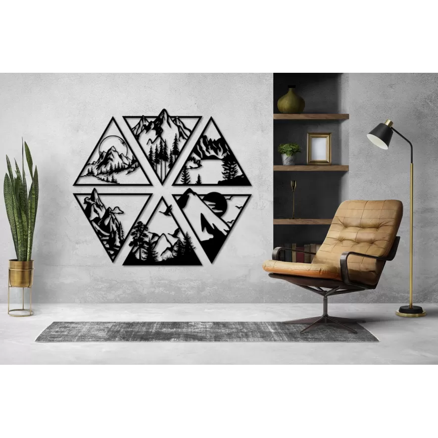 Această decoratiune impresionantă din HDF (High-Density Fiberboard) cuprinde șase secțiuni triunghiulare, fiecare prezentând un peisaj montan diferit. Cu o dimensiune totală de 130 cm în înălțime și 110 cm în lățime, acest ansamblu hexagonal aduce un aer de natură și armonie în livingul tău. Designul său modern și detaliile fine fac ca fiecare scenă montană să fie o mică operă de artă, ideală pentru a crea un punct focal în orice încăpere. Culoarea neagră adaugă un contrast elegant și se potrivește perfect cu diverse stiluri de decor interior.