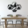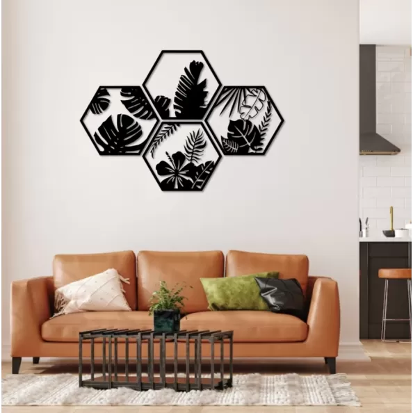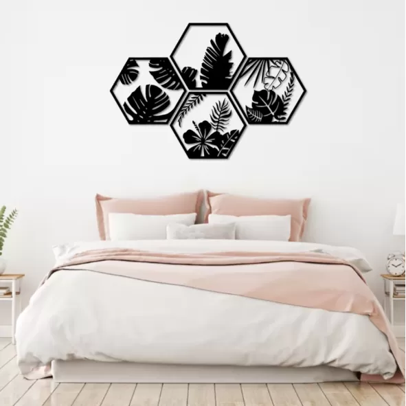 Transformă-ți peretele într-o operă de artă cu acest set de tablouri hexagonale elegante, ce combină elemente botanice decupate cu precizie. Cu dimensiuni de 140 cm x 96 cm, acest decor modern adaugă un strop de natură stilizată în orice spațiu interior. Perfect pentru living, birou sau dormitor!