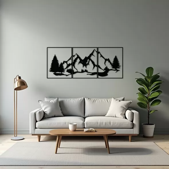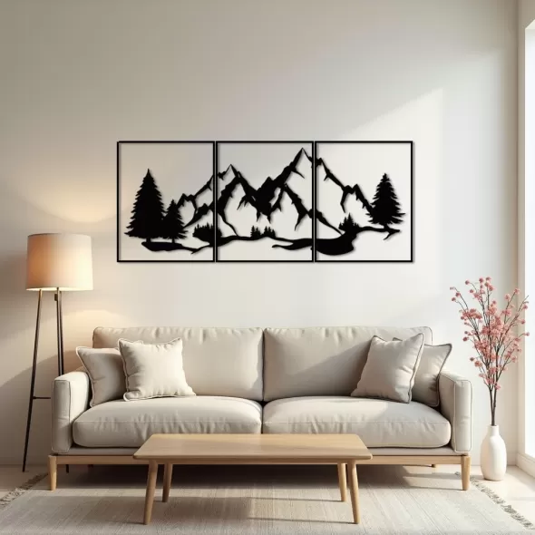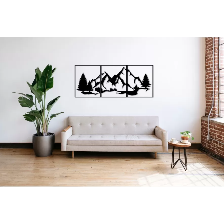 Această decoratiune din HDF (High-Density Fiberboard) este o piesă de artă modernă și elegantă, perfectă pentru a aduce un strop de natură în orice încăpere. Compoziția este formată din trei panouri care împreună formează o scenă panoramică montană, cu siluete de munți și copaci. Dimensiunile totale ale decoratiunii sunt de 125 cm în lungime și 60 cm în lățime, ceea ce o face ideală pentru a fi amplasată deasupra unei canapele sau pe un perete accent.